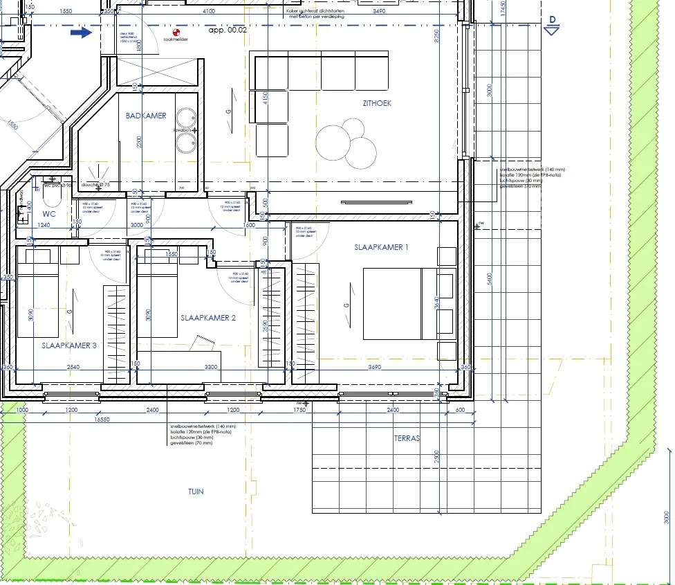 Dit nieuwbouwappartement is gelegen op het gelijkvloers en bestaat uit: inkomhal - toilet - living - open keuken - terras - nachthal - berging/wasplaats - 3 slaapkamers - badkamer.