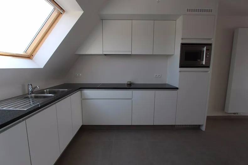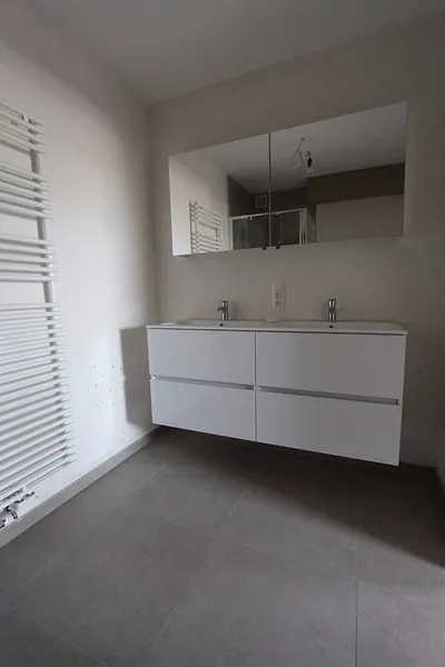 Nieuwbouwappartement op de derde verdieping, bestaande uit: inkomhal, toilet met lavabo, living, zonnig terras, volledig ingerichte keuken, berging, wasplaats, 2 slaapkamers, badkamer met douche / badkamermeubel met dubbele lavabo/ toilet, garage. Geen huisdieren toegelaten. Direct beschikbaar. Huurprijs 645 €/mnd + 50 €/mnd syndickosten + 50 €/mnd huur garage.