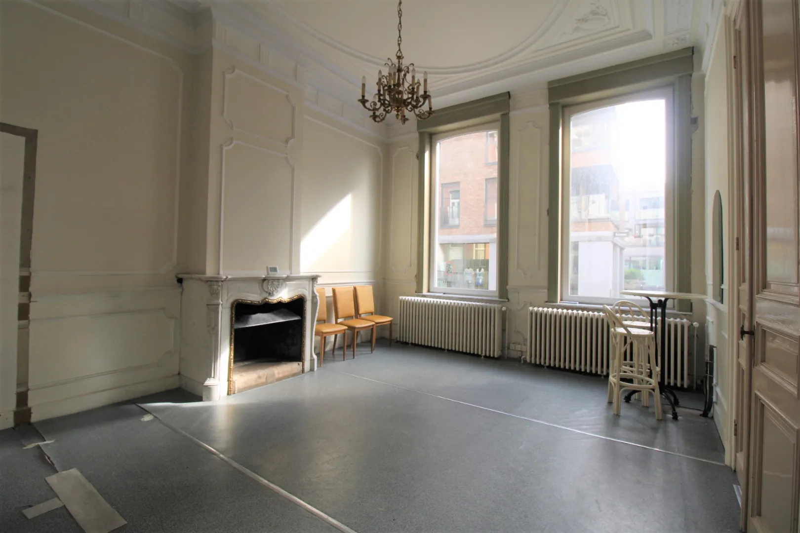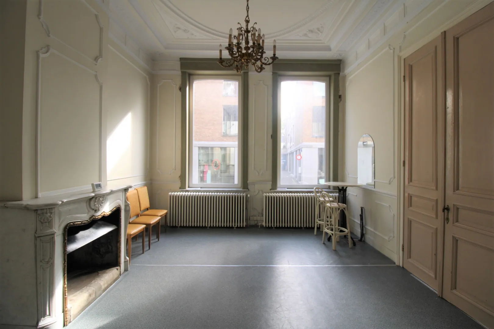 Ruime inkomhal - twee voorplaatsen/praktijkruimtes - grote handelsruimte - terras - uitgeruste keuken - badkamer met 2 aparte toiletten - technische ruimte en ruime kelder