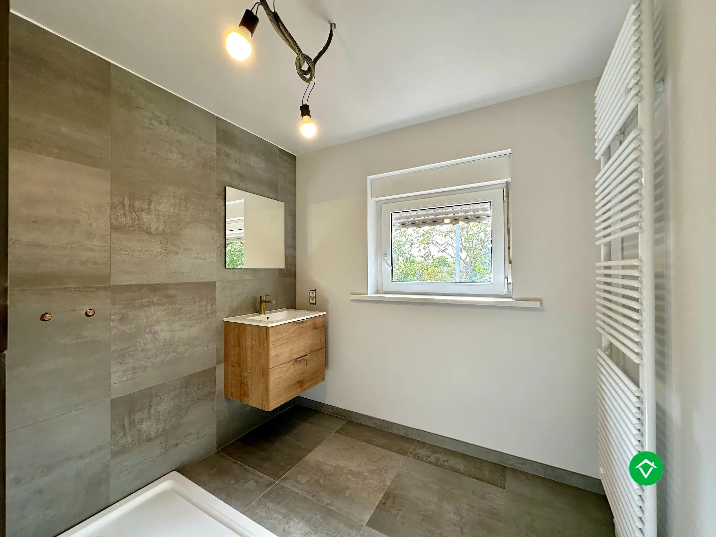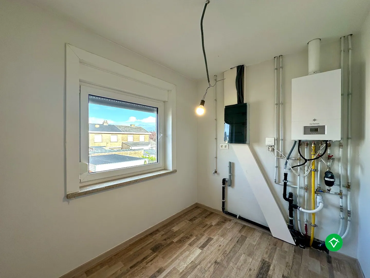 Op de eerste verdieping bevinden zich twee ruime slaapkamers, een moderne badkamer met inloopdouche en lavabomeubel, en een technische ruimte die ook als extra bergruimte kan dienen.