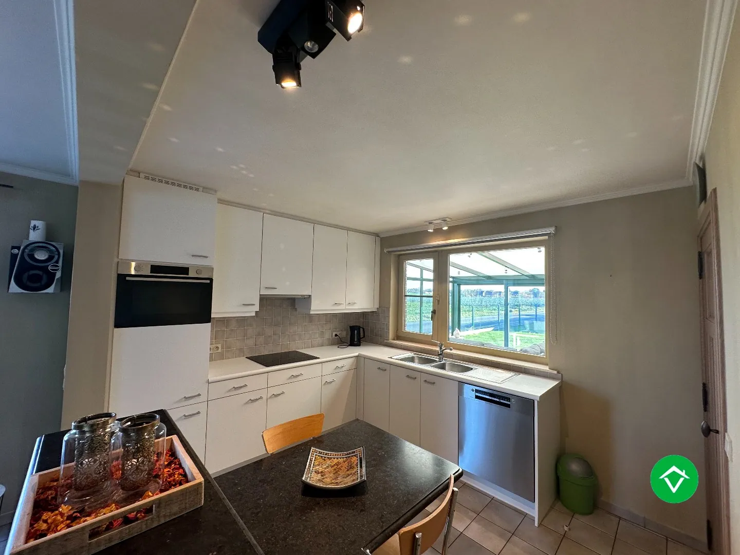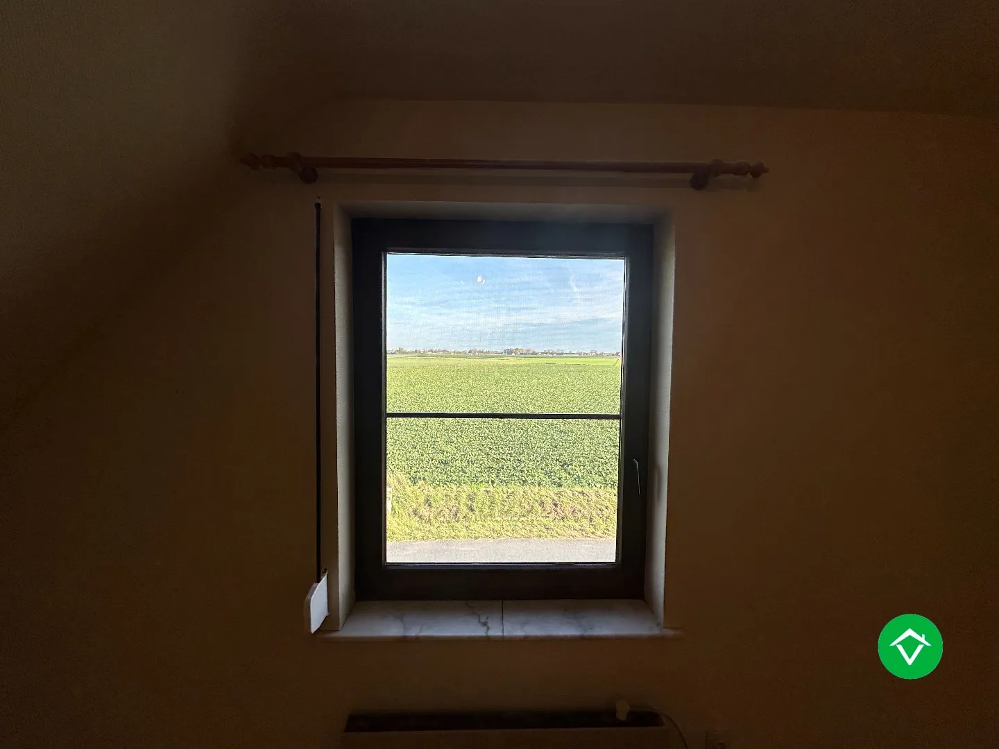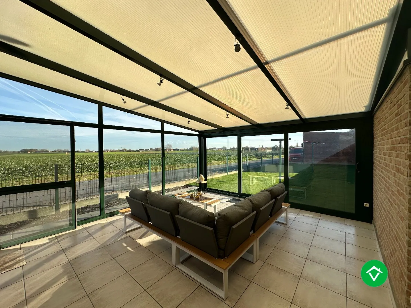 Binnenin vind je een gezellige leefruimte met pelletkachel, een open keuken, een praktische wasruimte, veranda met zicht op de tuin en de achterliggende velden, en een toilet op het gelijkvloers.