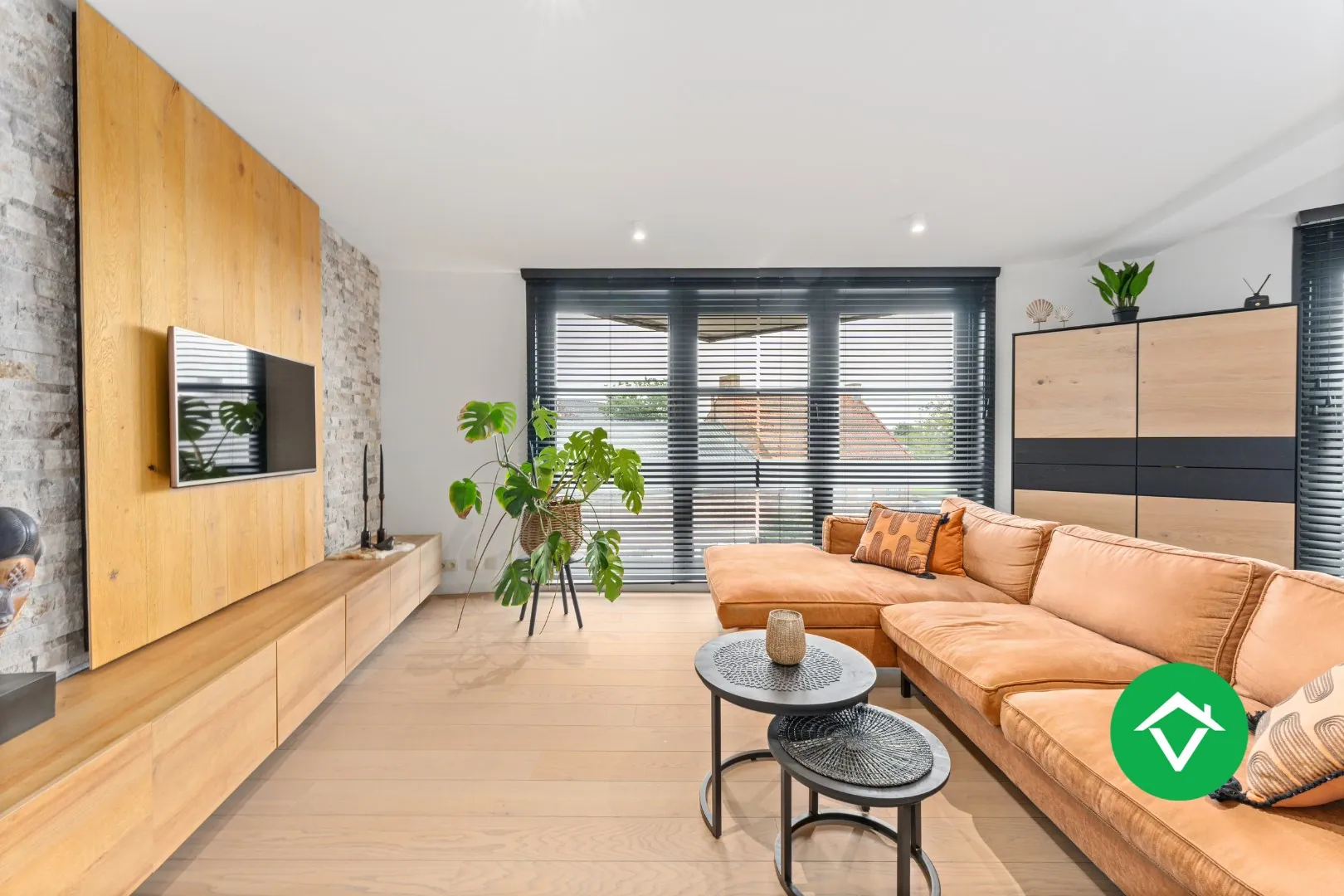 De woonkamer geeft toegang tot het eerste terras met uitzicht over de Ringlaan.