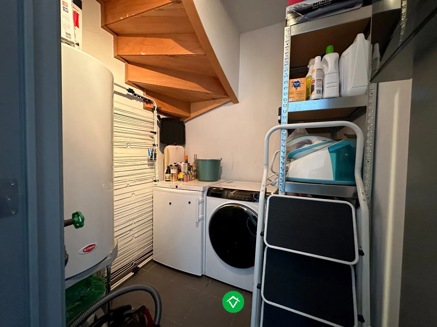 Binnenkomen doet u in de lichtrijke woonkamer, opgesplitst in eet- en zitkamer. Aansluitend ligt de uitgeruste keuken. Verder kan u een gastentoilet terugvinden, alsook een berging/- wasplaats.