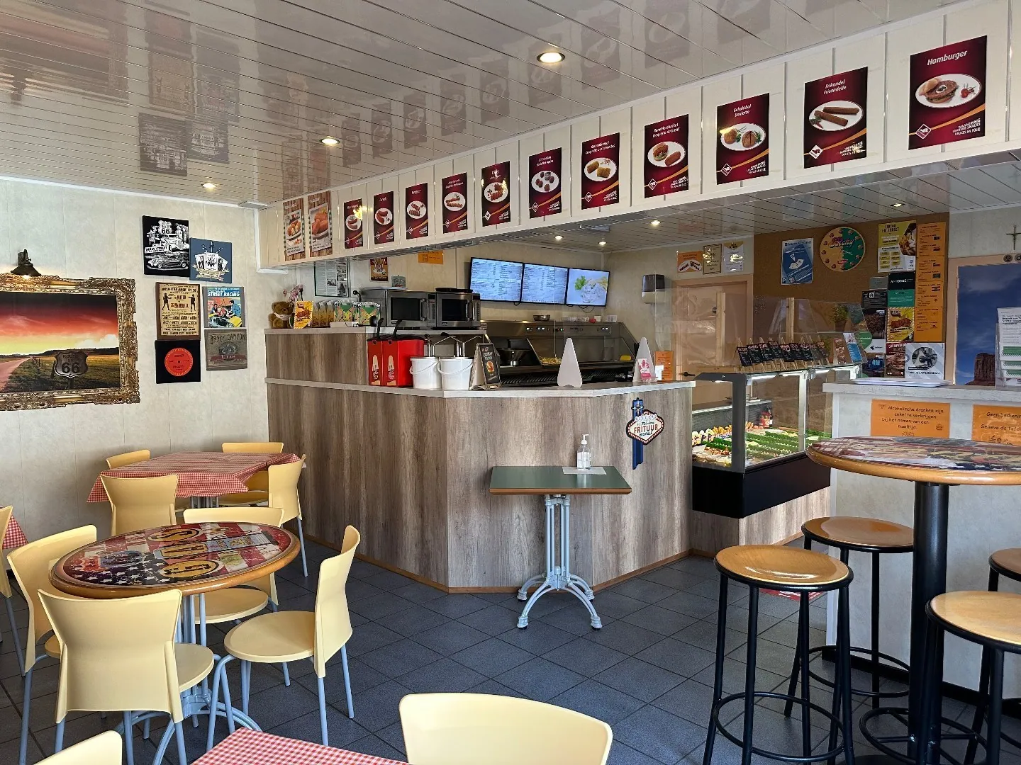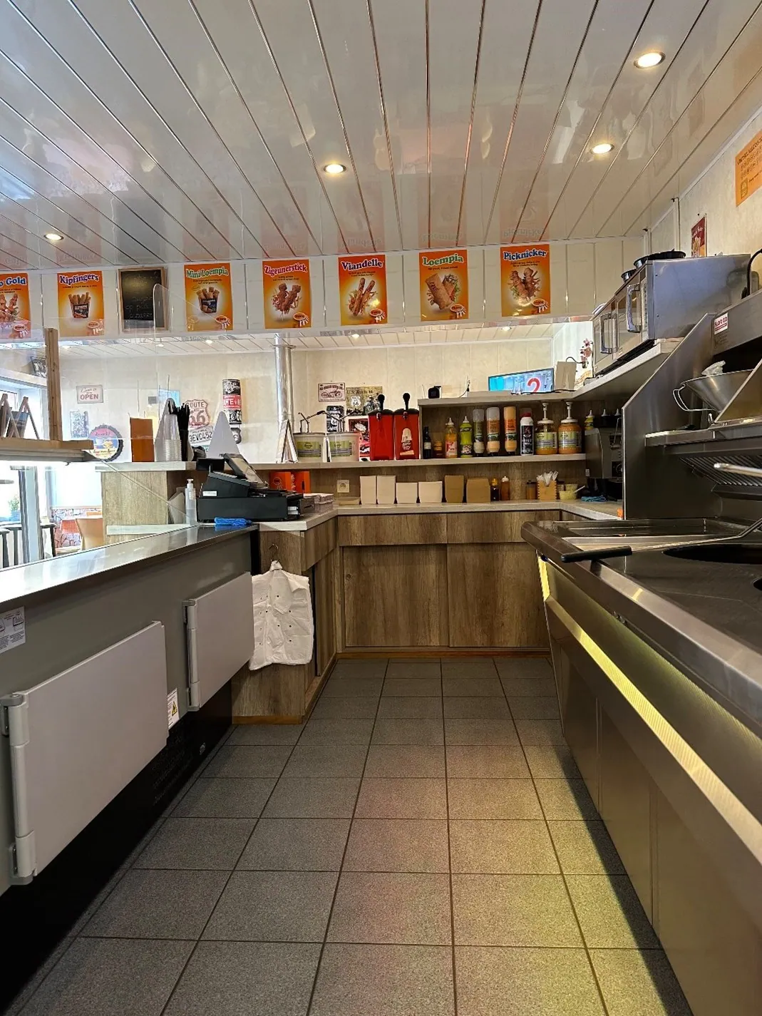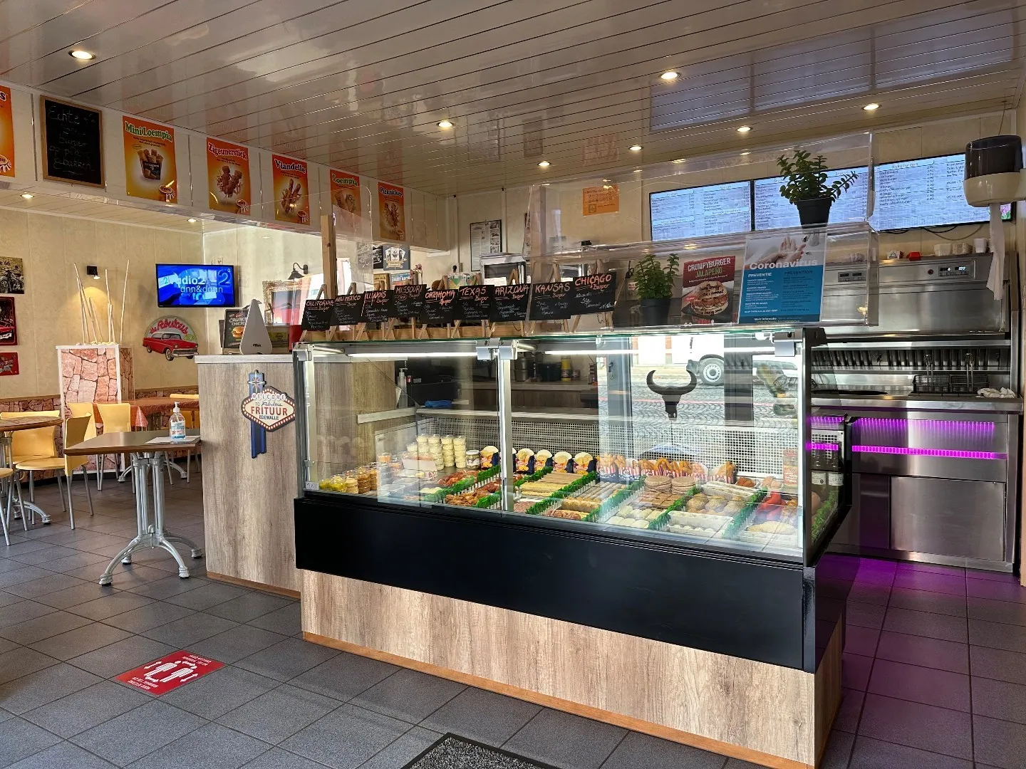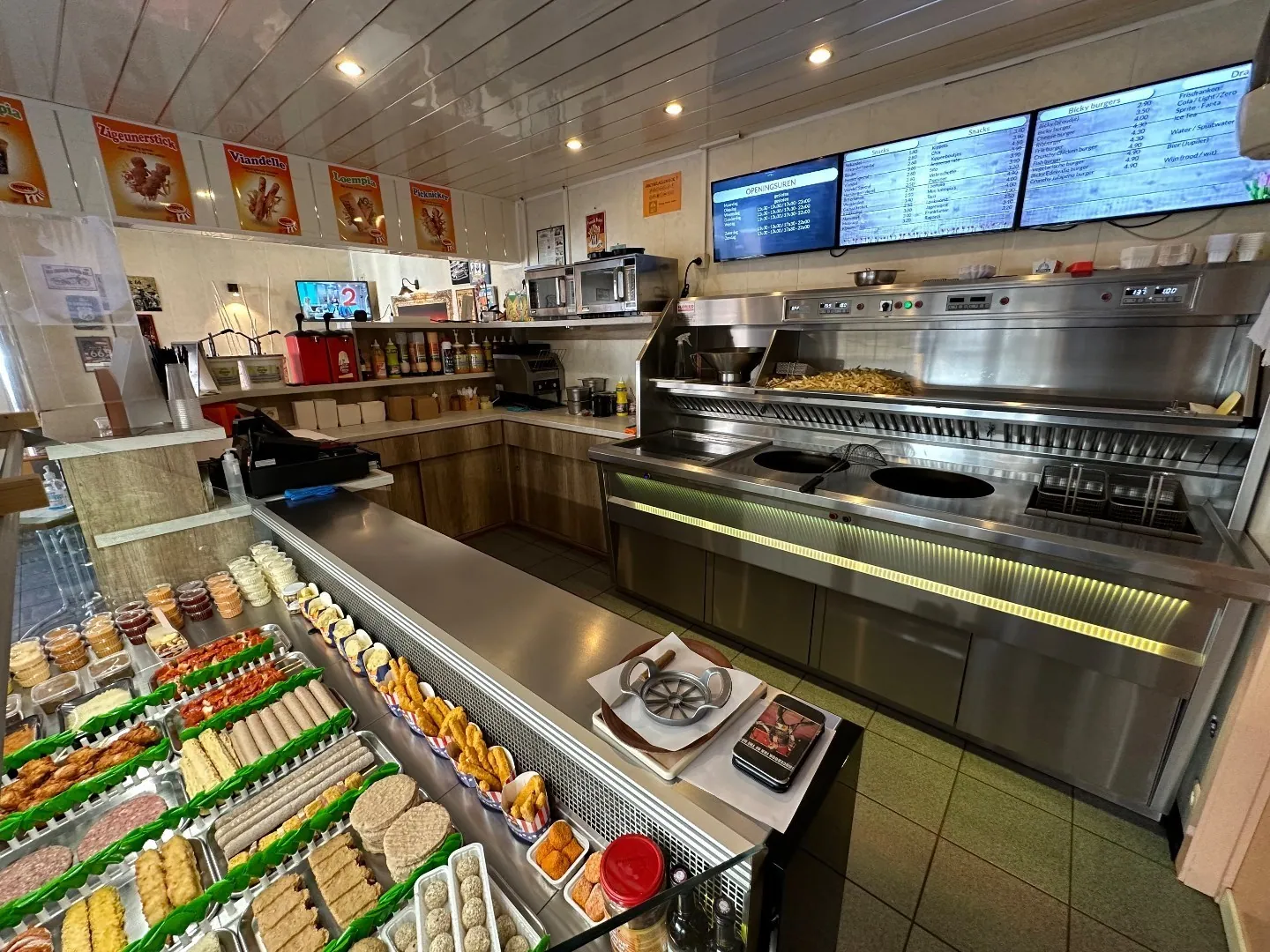 friteuse (Florigo/ snack, voor -en afbak) met geïntegreerde bakplaat en 10 plaatsen op het terras buiten, een standaard keuken met diepvriezers en frigocel.