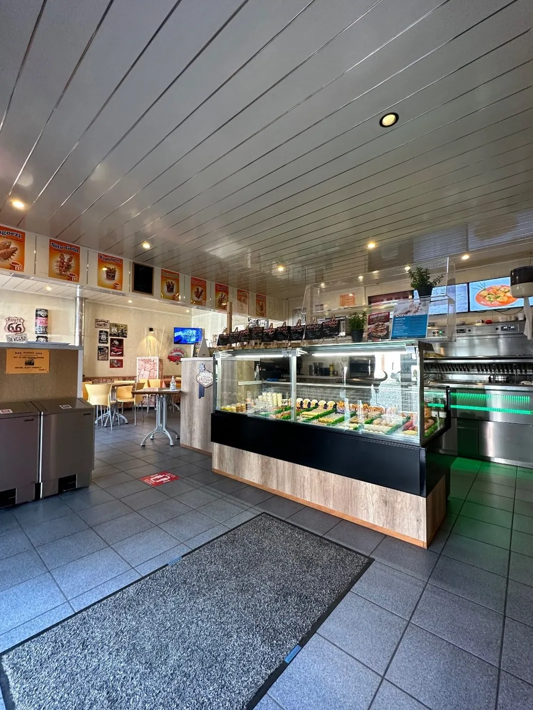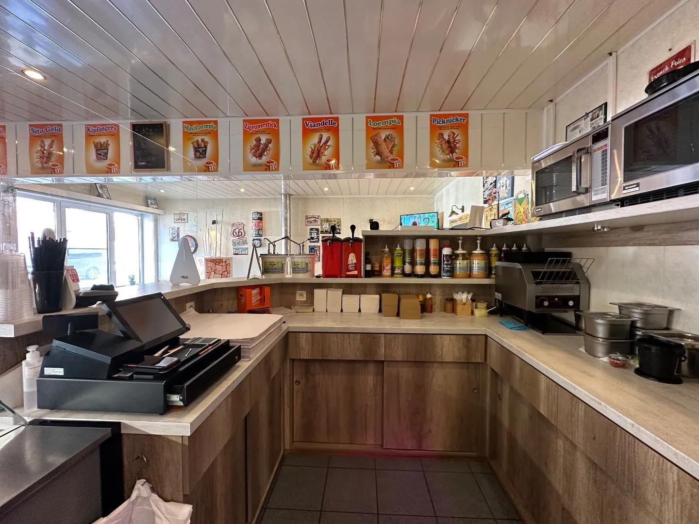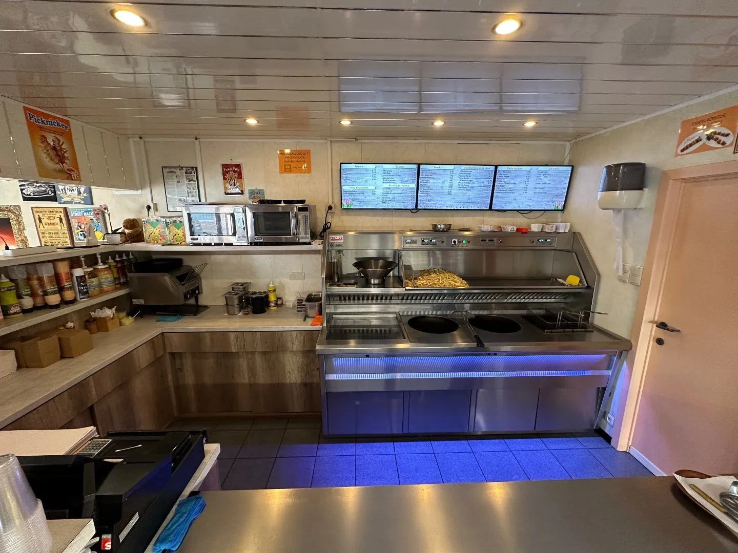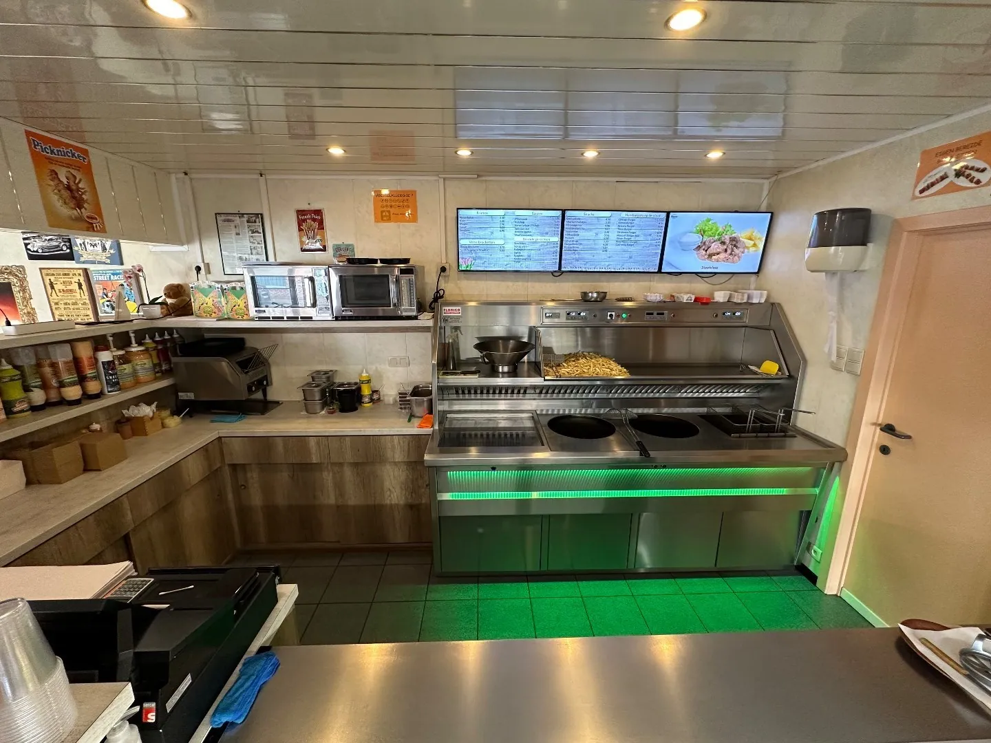 friteuse (Florigo/ snack, voor -en afbak) met geïntegreerde bakplaat en 10 plaatsen op het terras buiten, een standaard keuken met diepvriezers en frigocel.