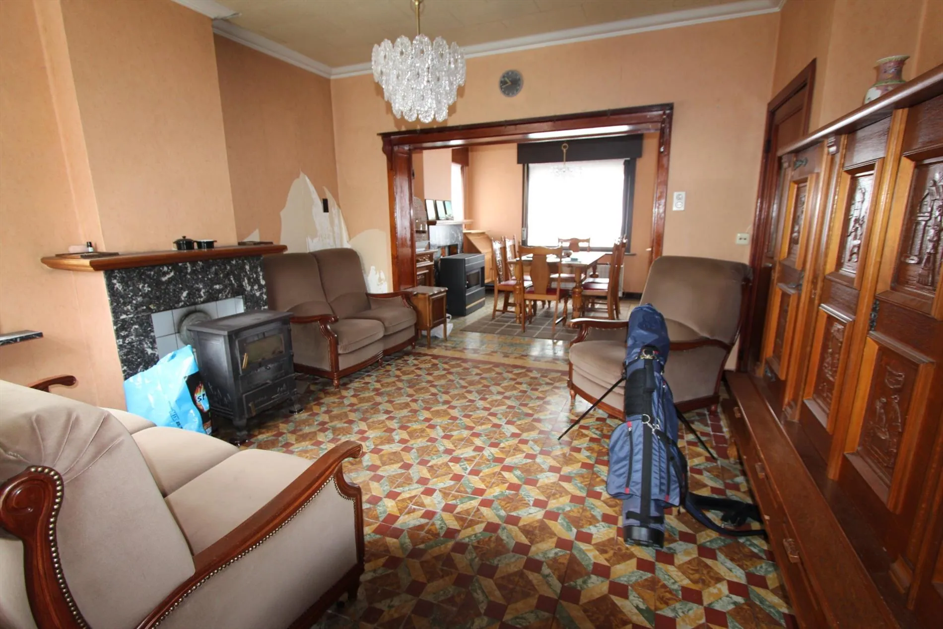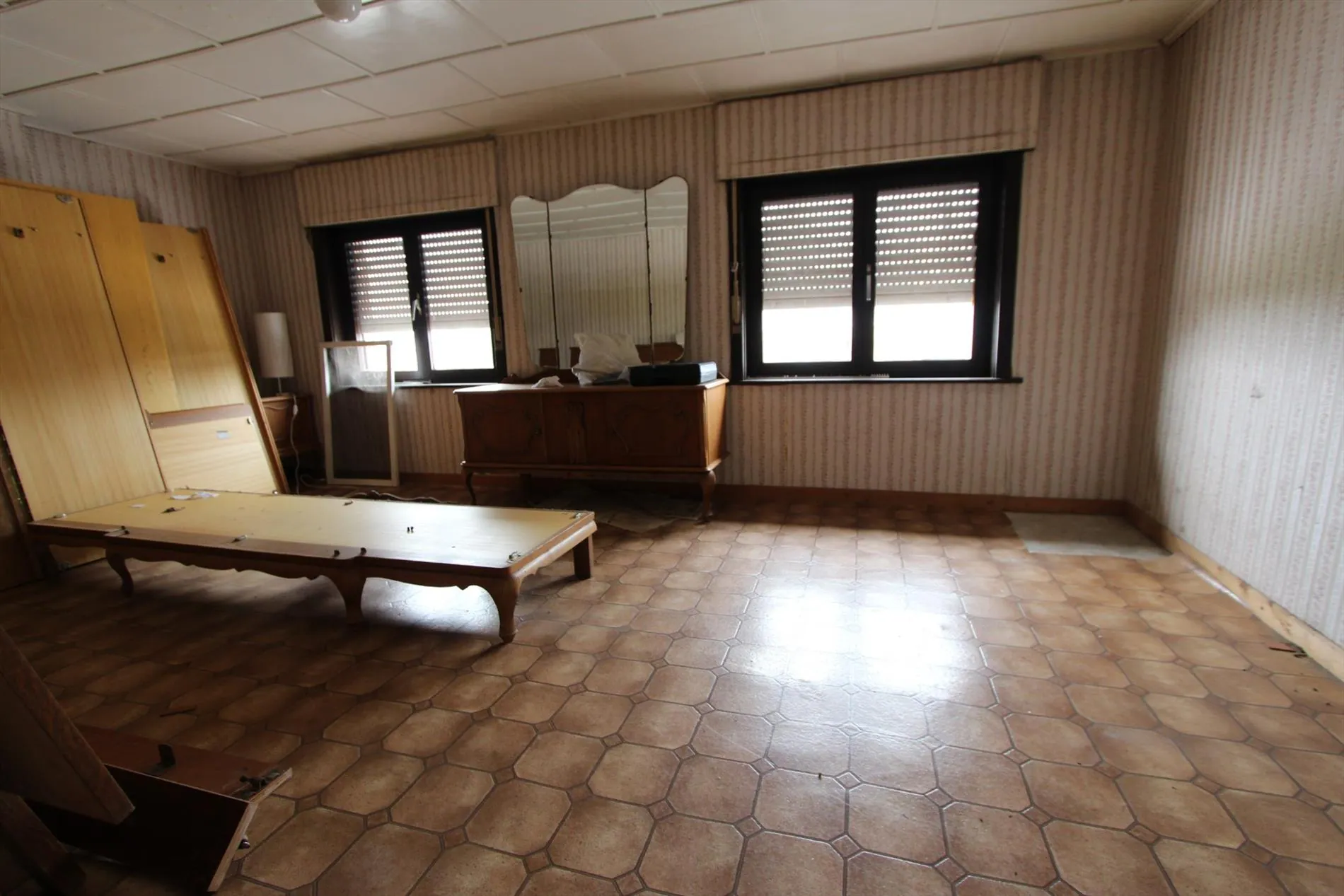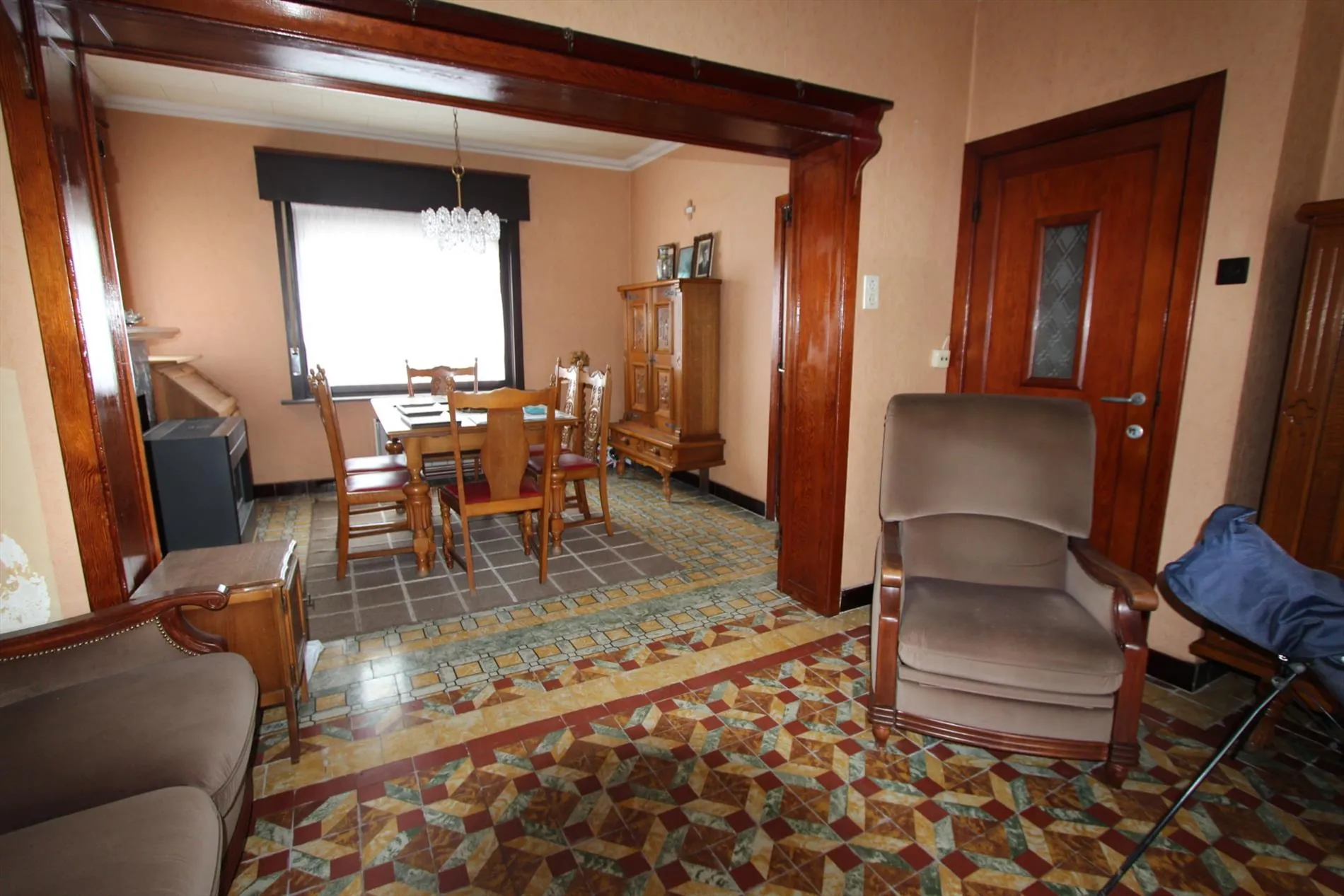 Deze halfopen bebouwing is gelegen op een grondoppervlakte van 720 m² en bestaat uit: inkomhal - living - keuken - kelder - veranda - badkamer - toilet - tuin - garage - oprit - 2 slaapkamers. Vaste trap naar de zolder met mogelijkheid tot inrichten van meerdere slaapkamers.