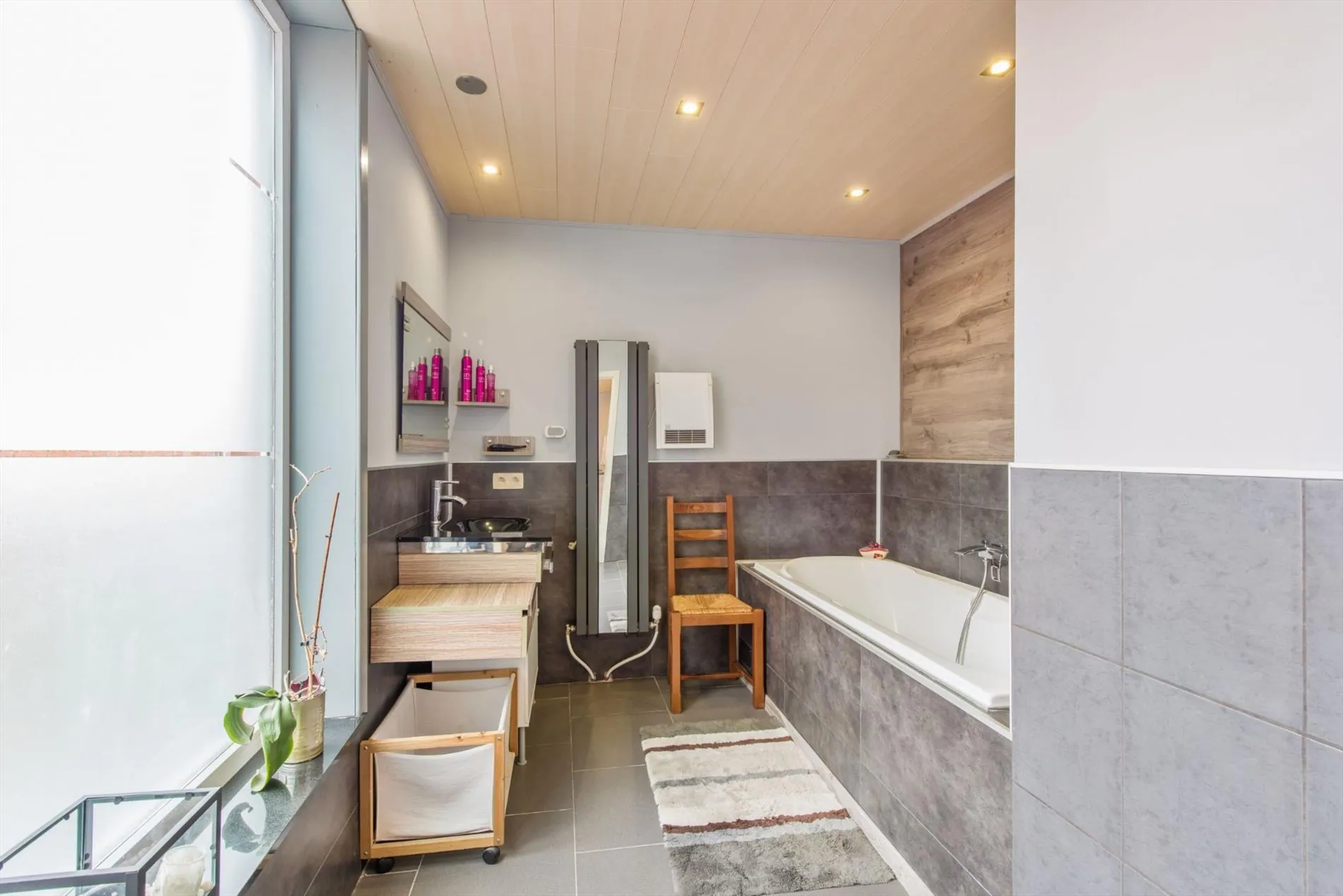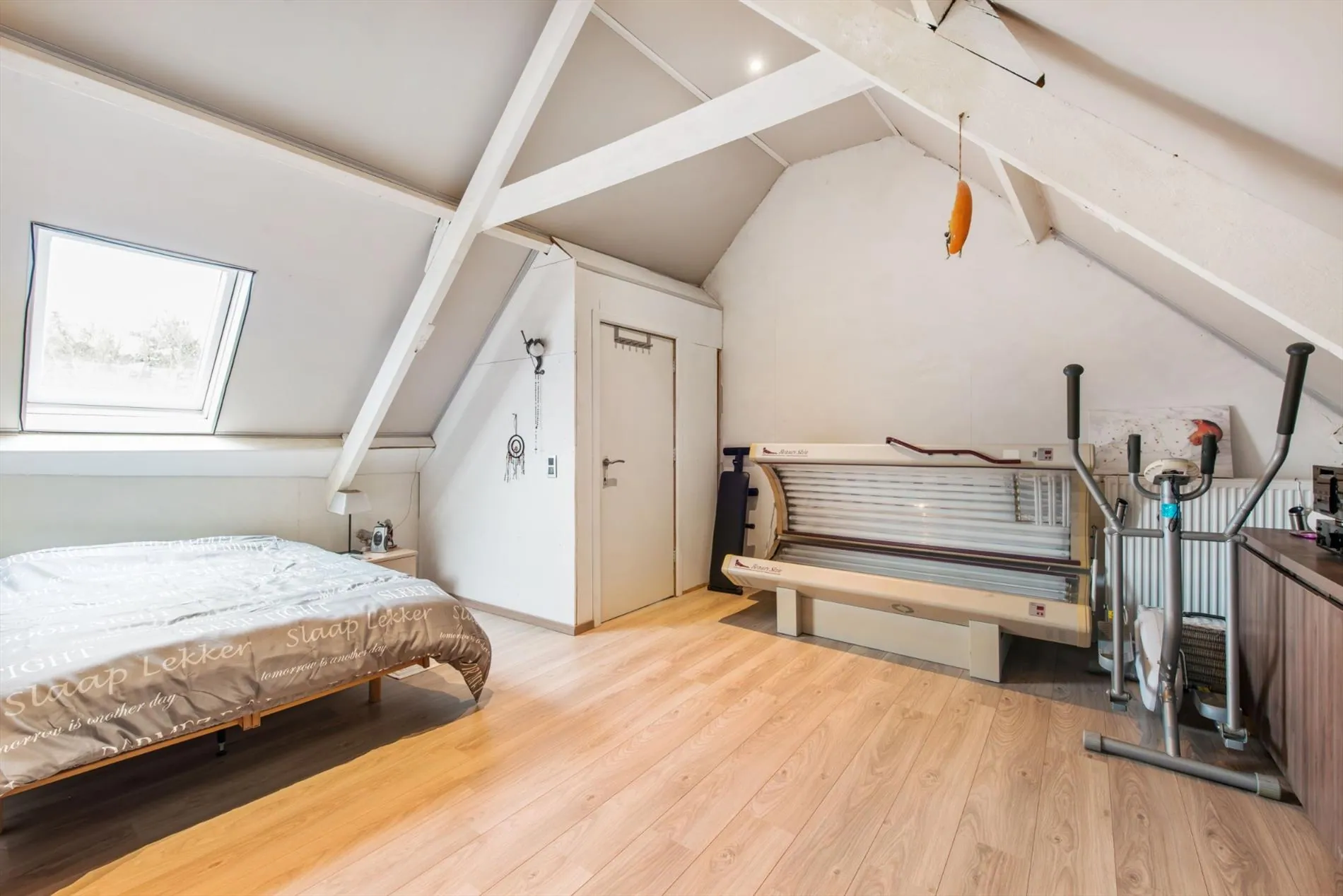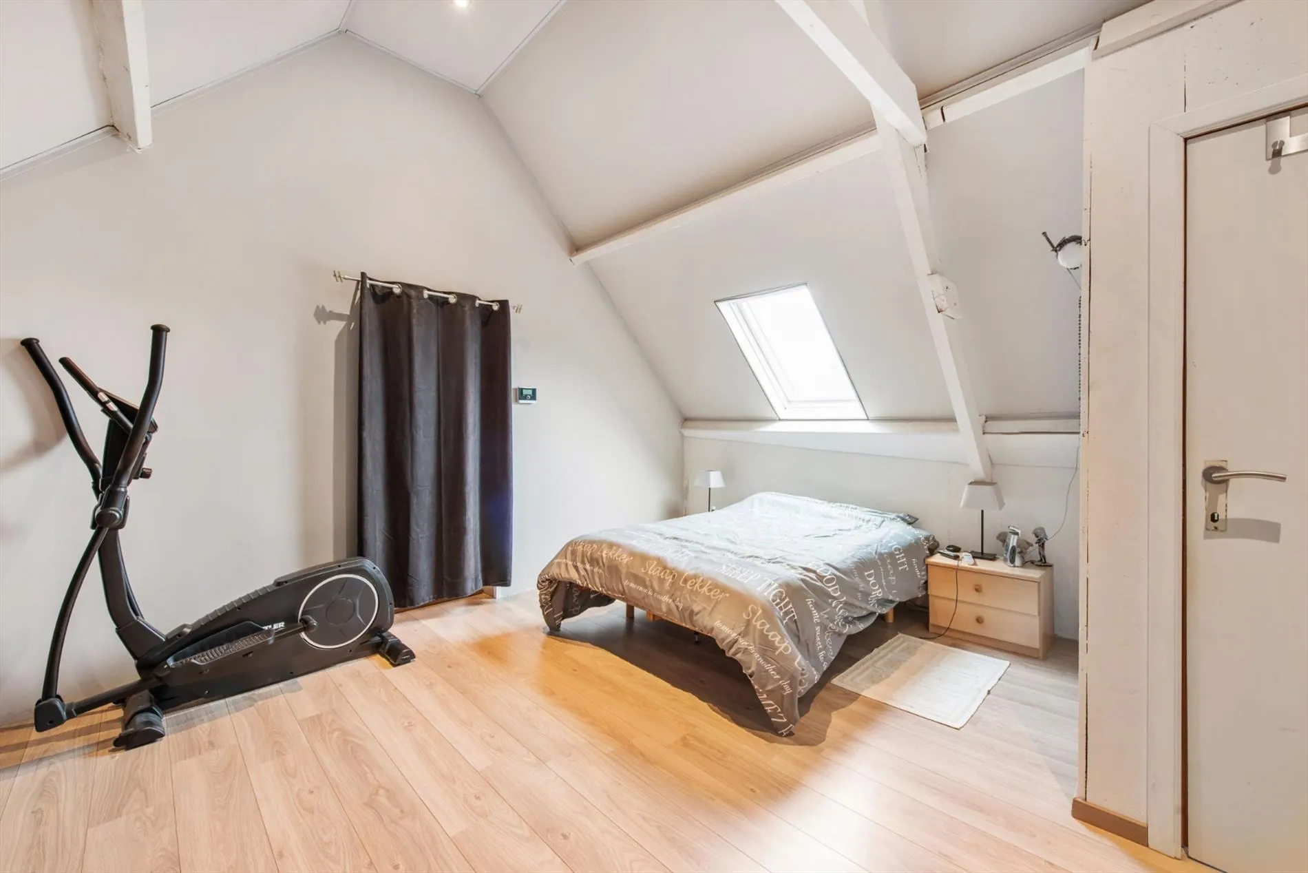 Op de eerste verdieping treffen we twee ruime slaapkamers , de tweede badkamer (voorzien van douche ,wastafel en toilet), een dressing en een bureau. In de zolderruimte werd gebruik gemaakt van de balkenstructuur om een prachtige slaapkamer te creëren met dressing.