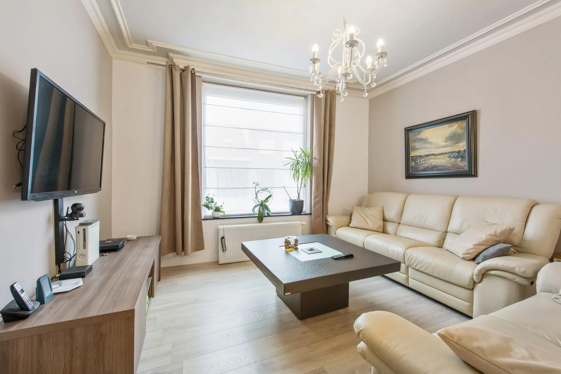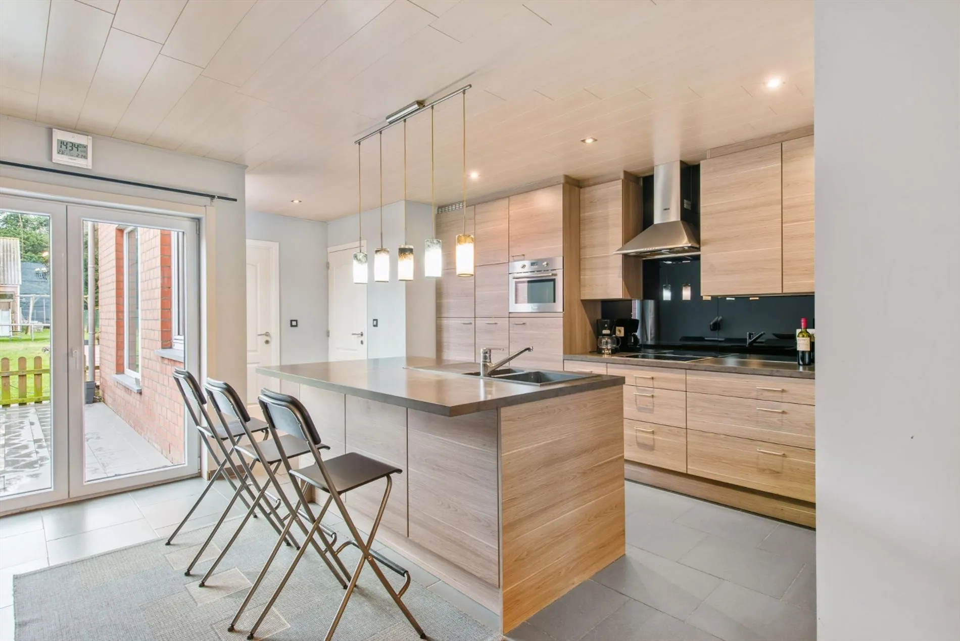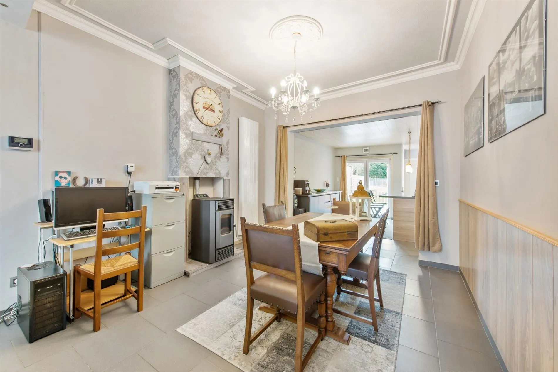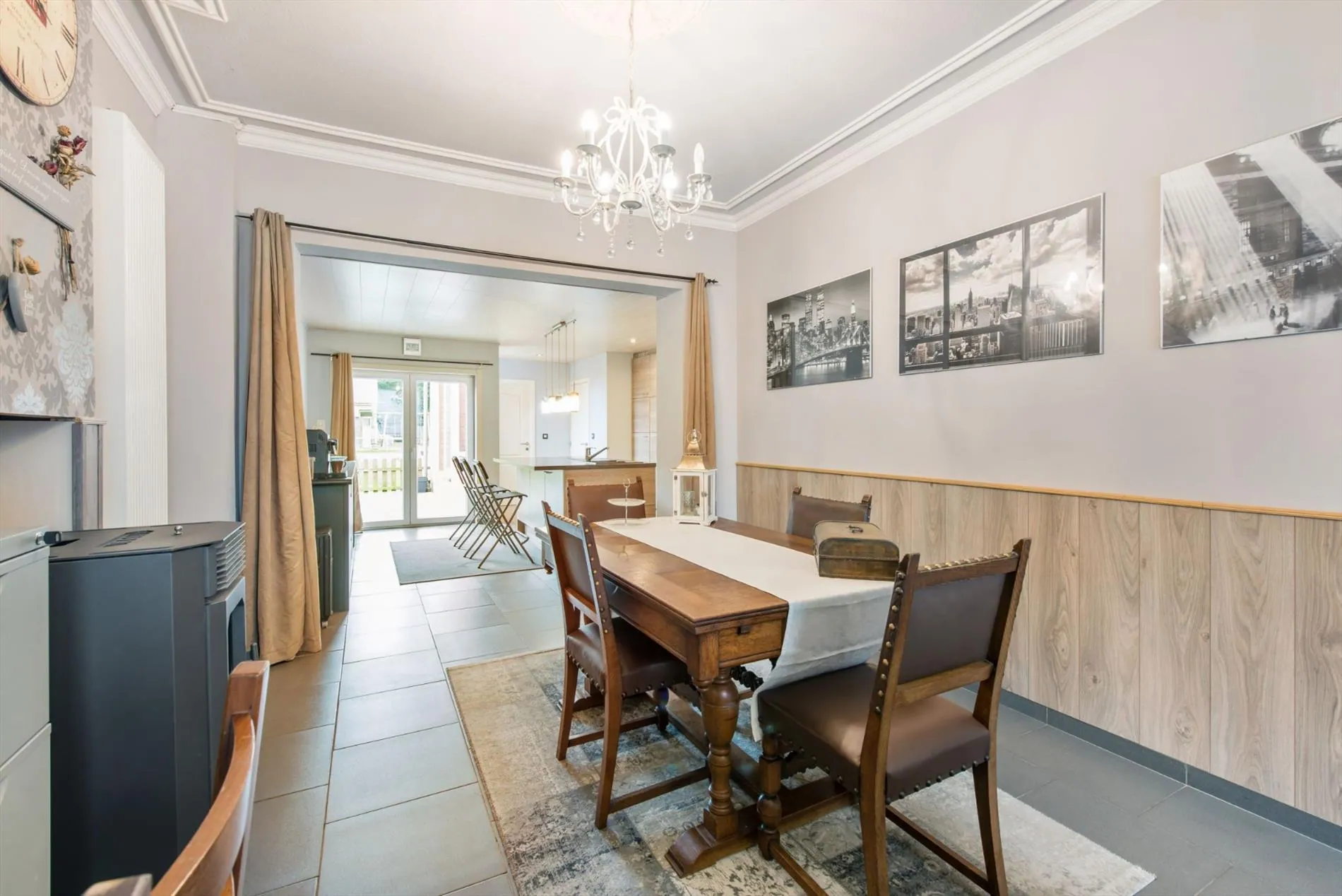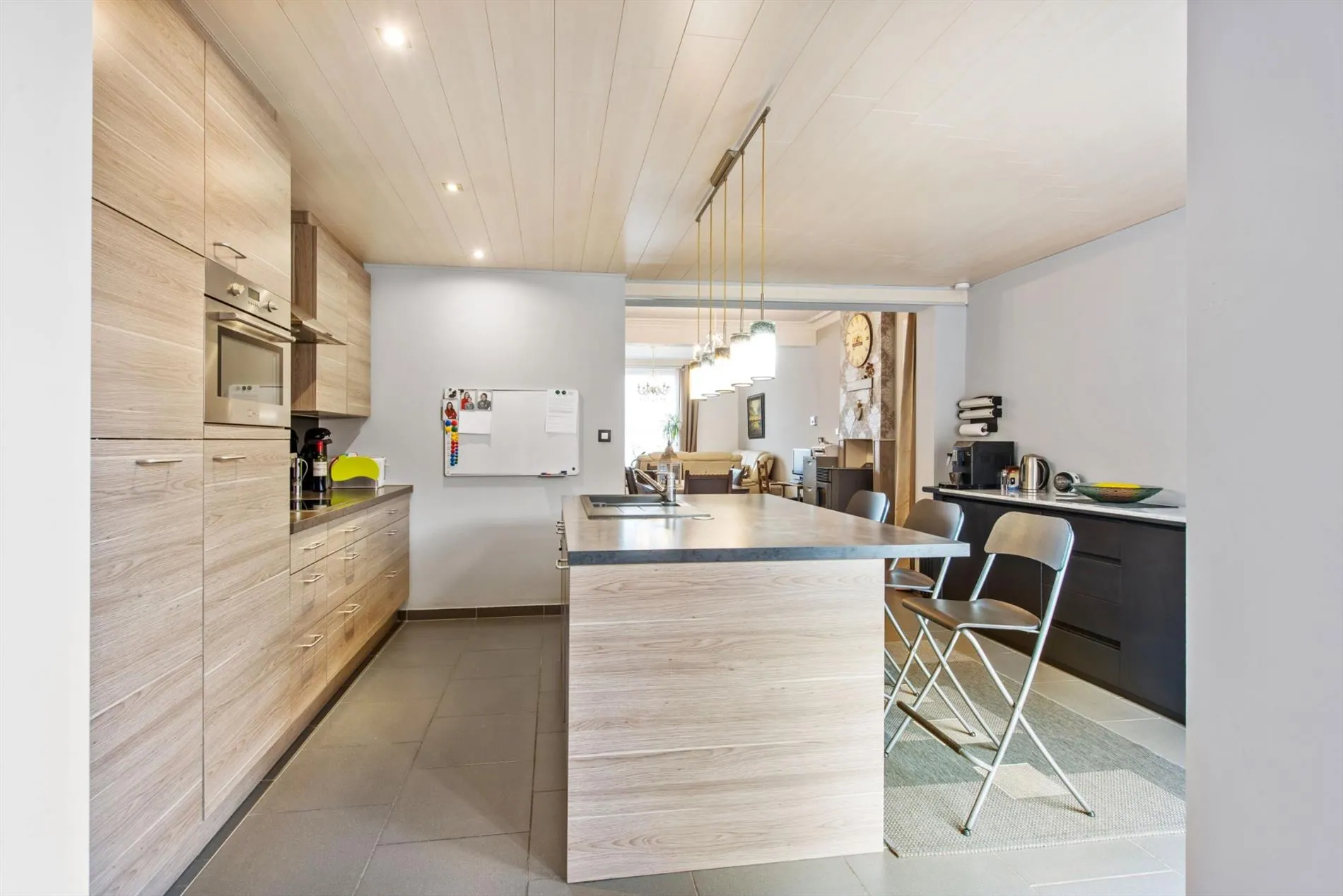 We betreden de woning via de inkomhal die toegang biedt tot de prachtig gerenoveerde leefruimte, de volledig nieuwe keuken, badkamer en toilet. Vanuit de open moderne keuken heb je zicht op de prachtige ruime tuin. De ruime keuken is volledig geïnstalleerd en voorzien van elektrische kookplaat, dampkap, vaatwas, frigo en combi-oven.