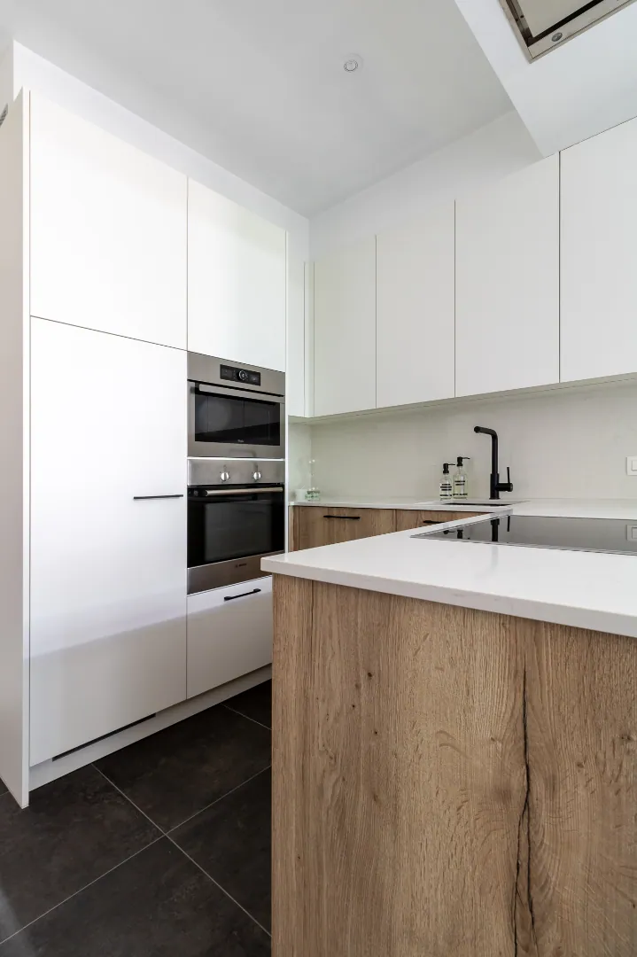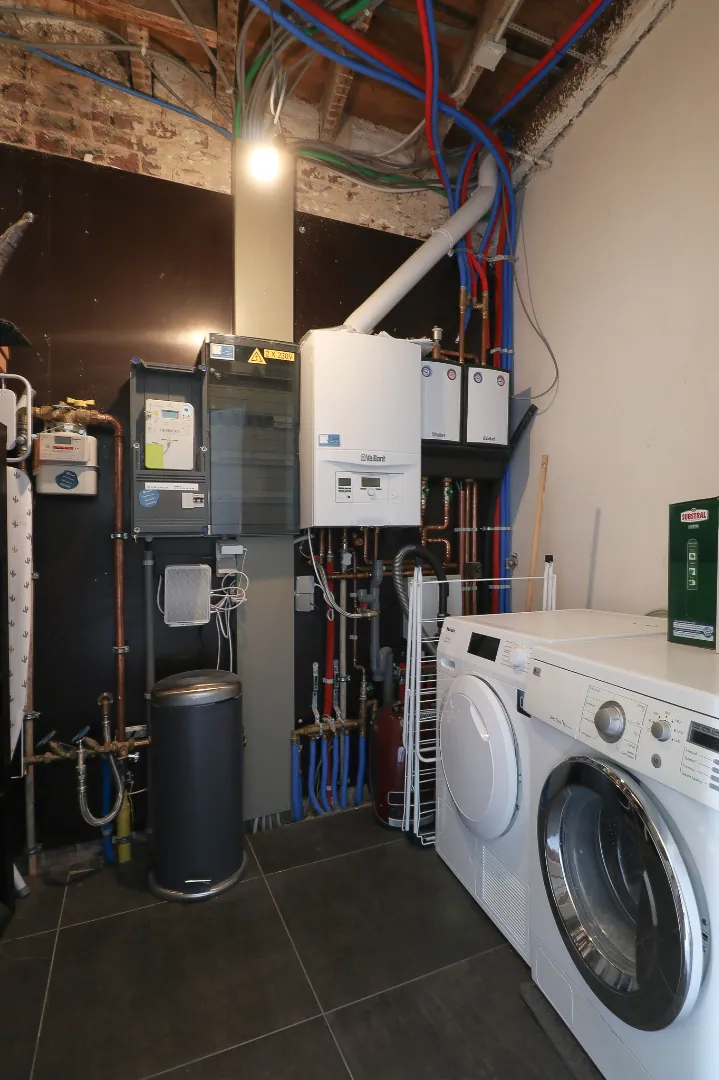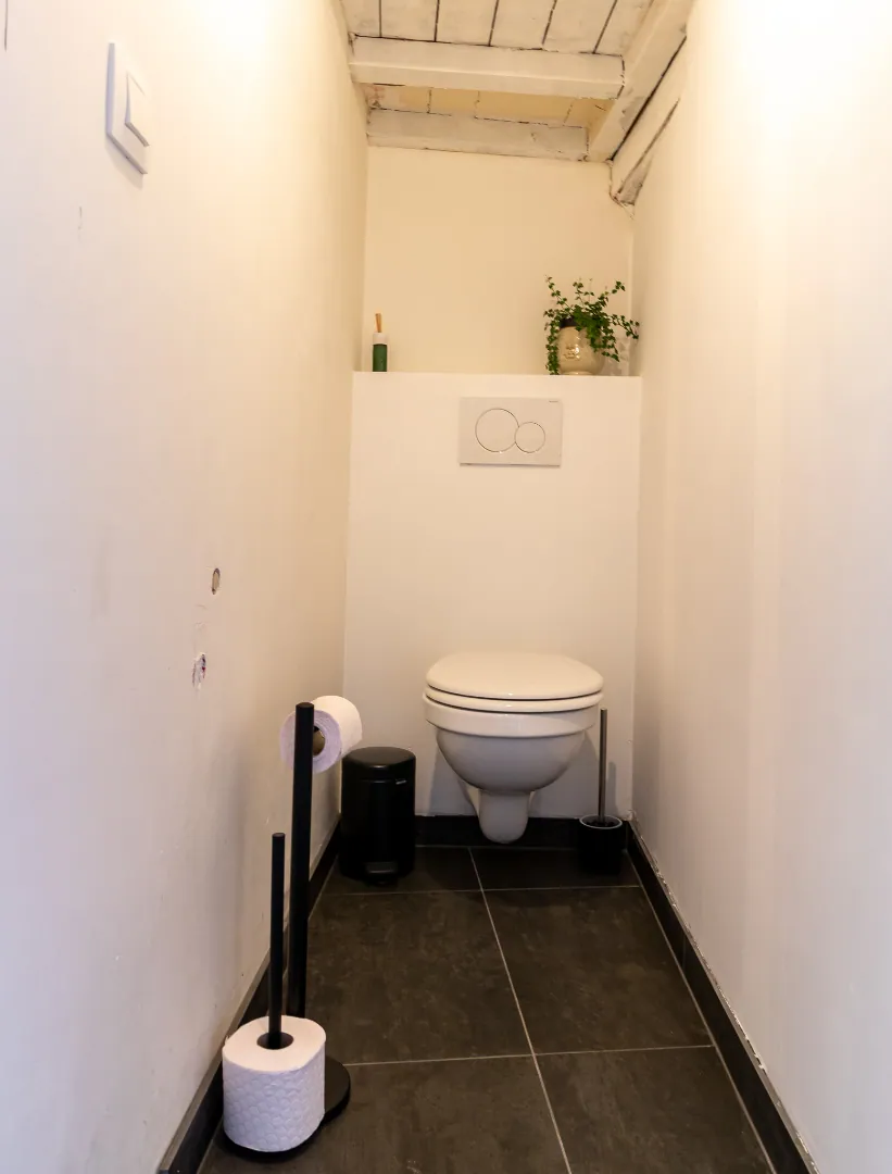 Het gastentoilet bevindt zich alsook in de inkomhal. Vervolgens vindt u de kwalitatieve open keuken, deze is voorzien van een inductiekookplaat, vaatwasser, microgolfoven, oven en koelkast.
