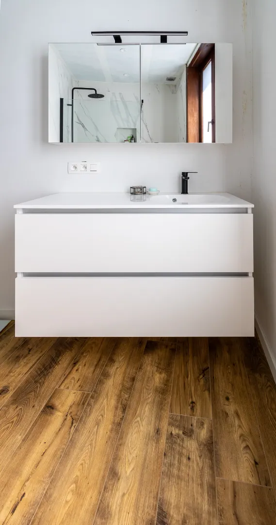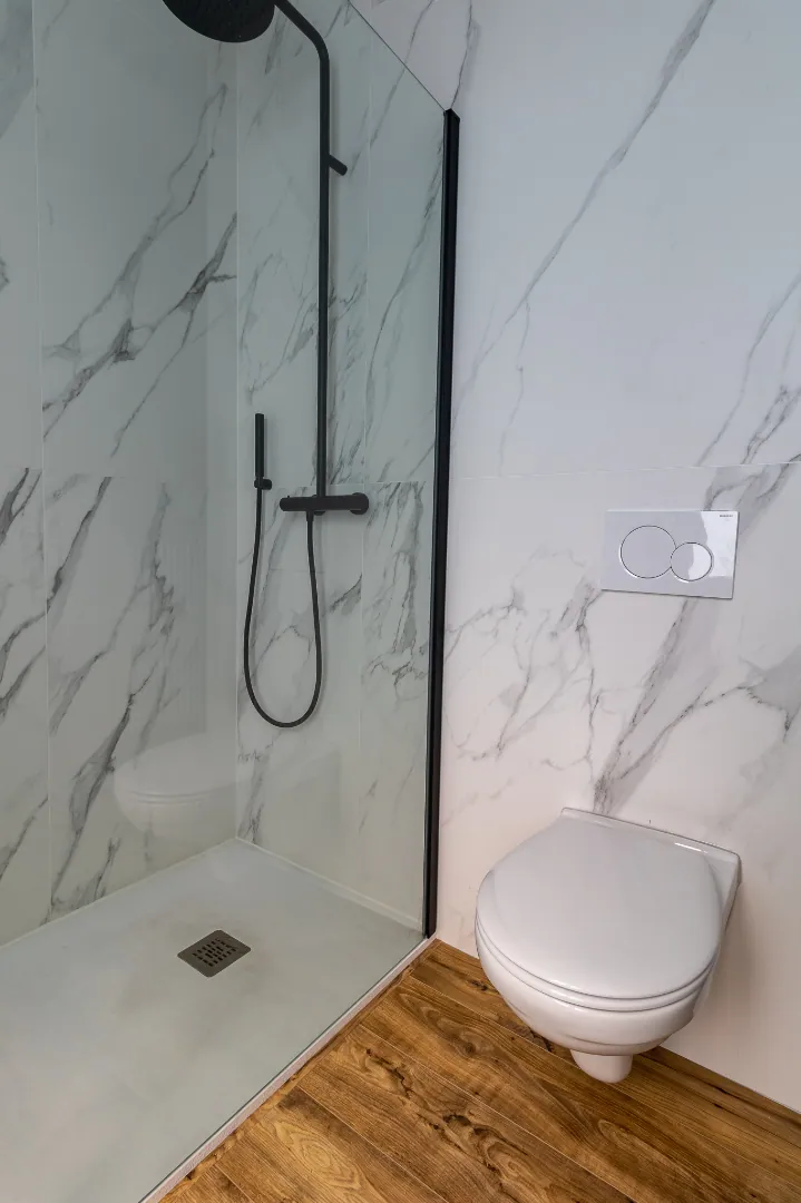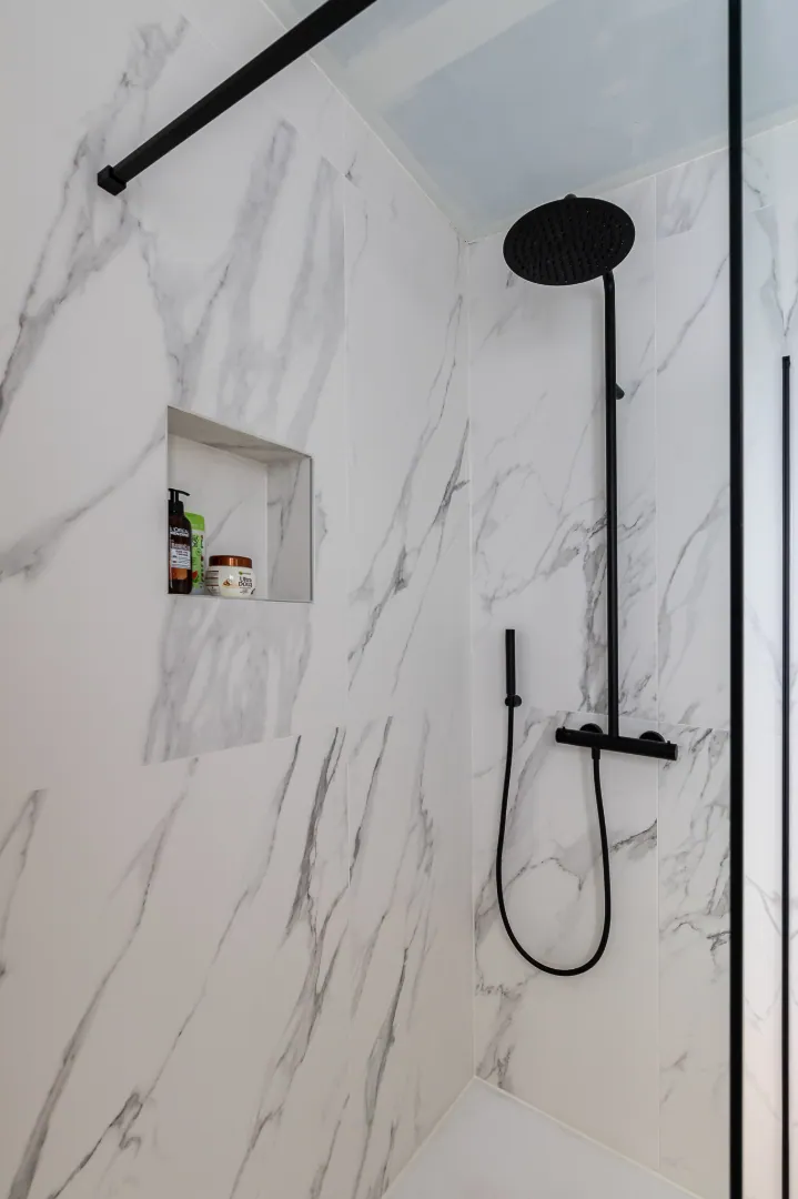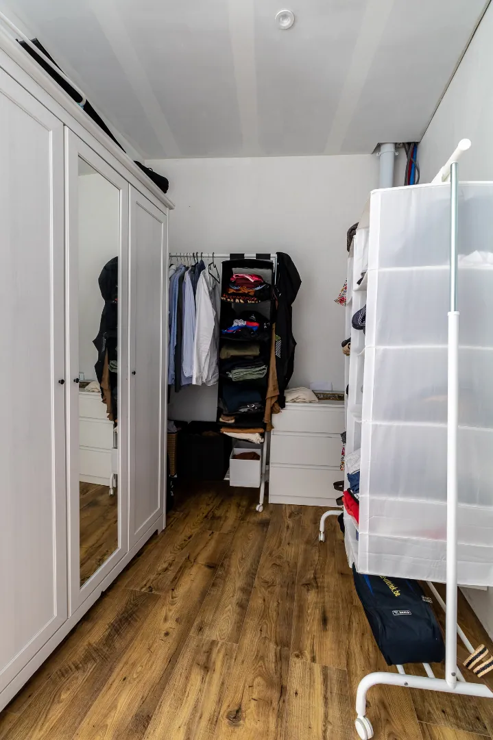 Op het eerste verdiep bevindt zich een slaapkamer met dressing en aansluitend de recente badkamer met moderne look. De badkamer is voorzien van een ruime inloopdouche, wastafel met meubel en toilet.