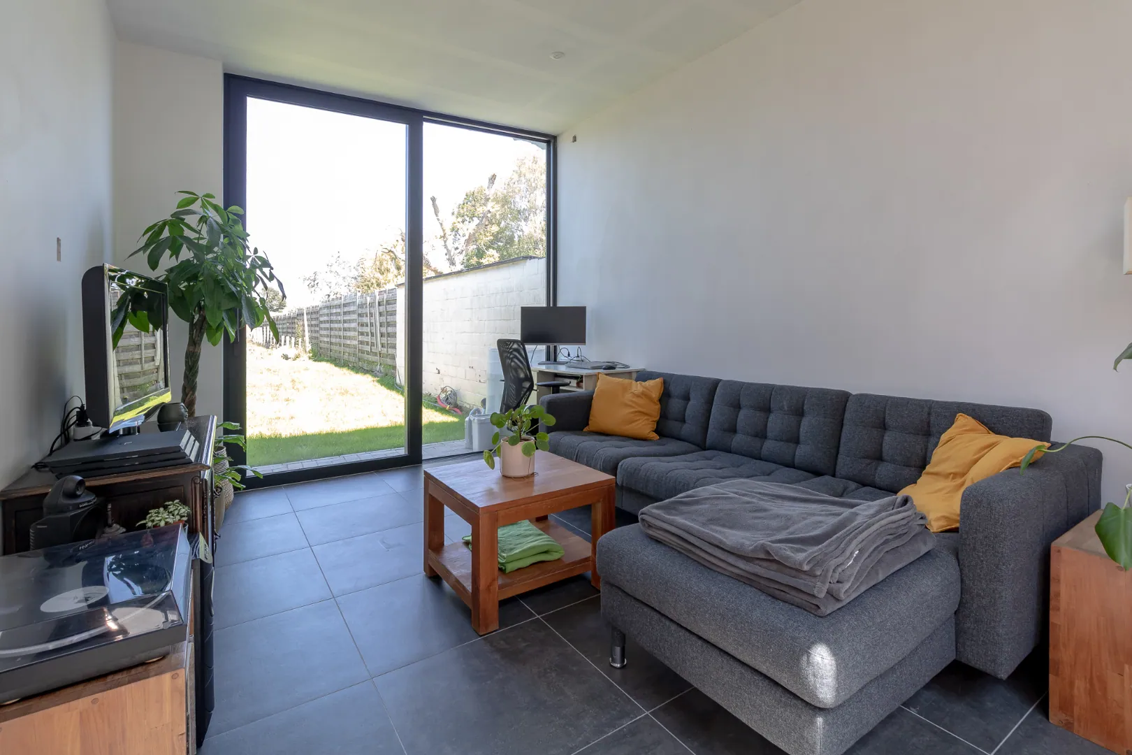Vervolgt situeert zich de woonkamer die uitzicht heeft op de zonnige, onderhoudsvriendelijke tuin.