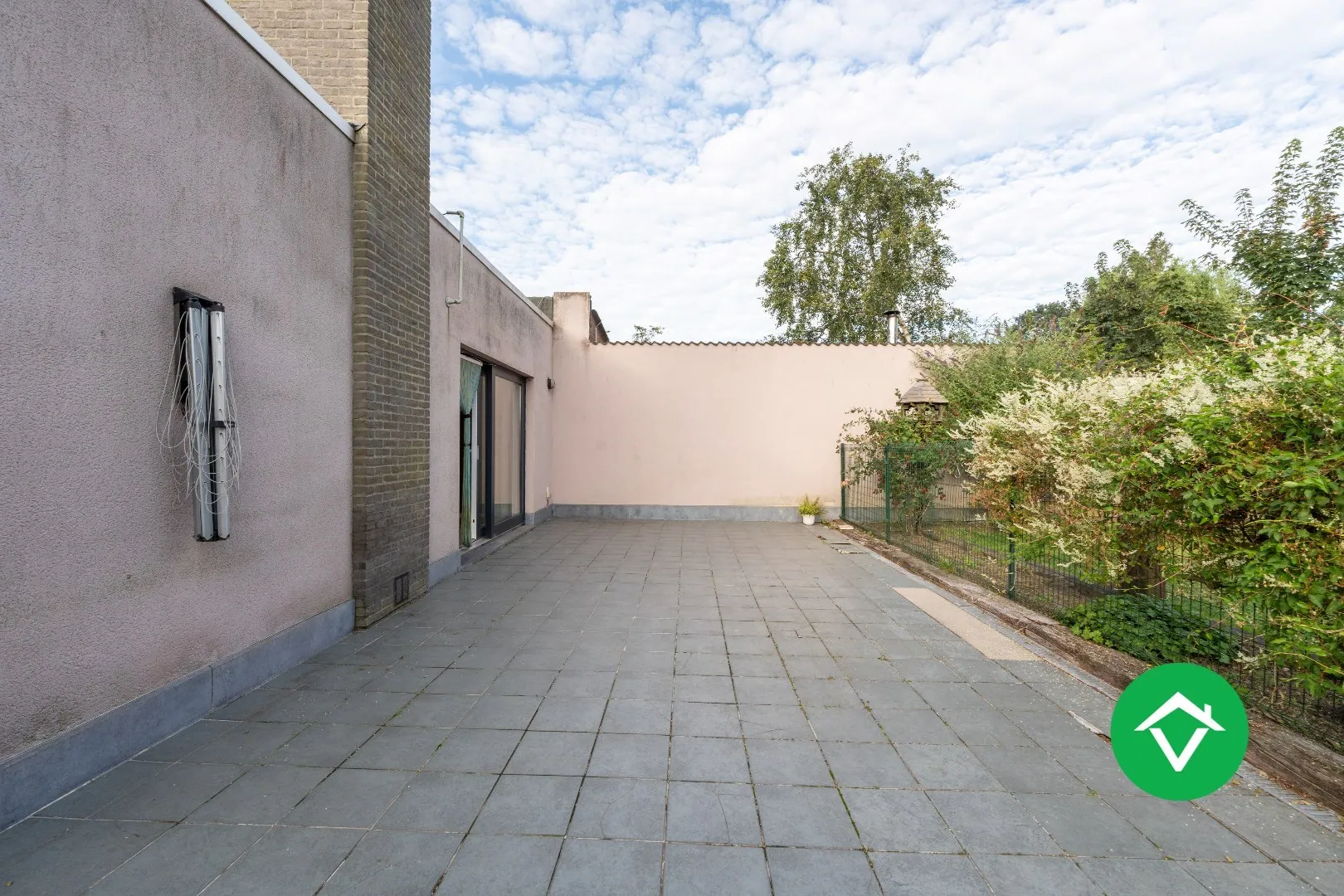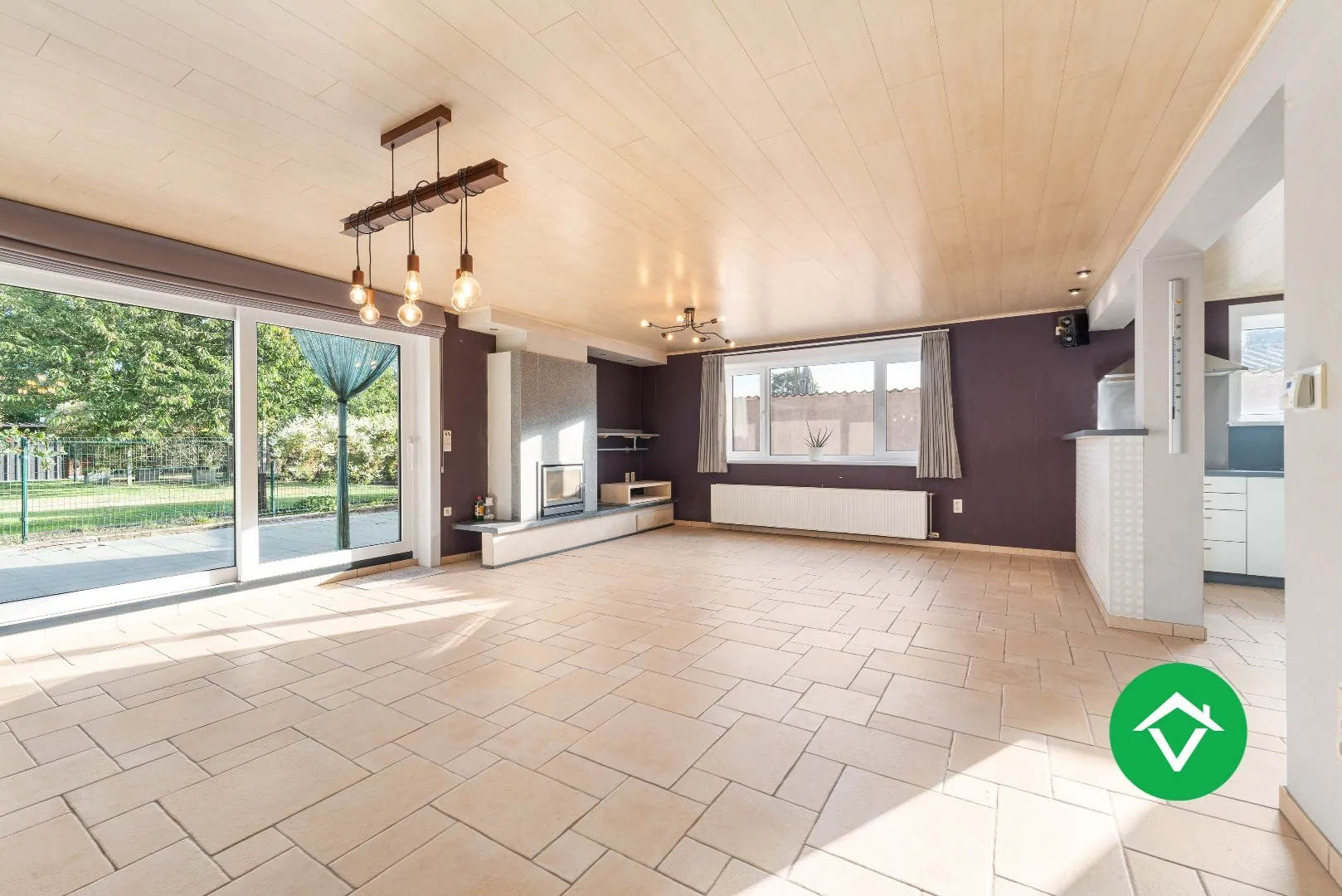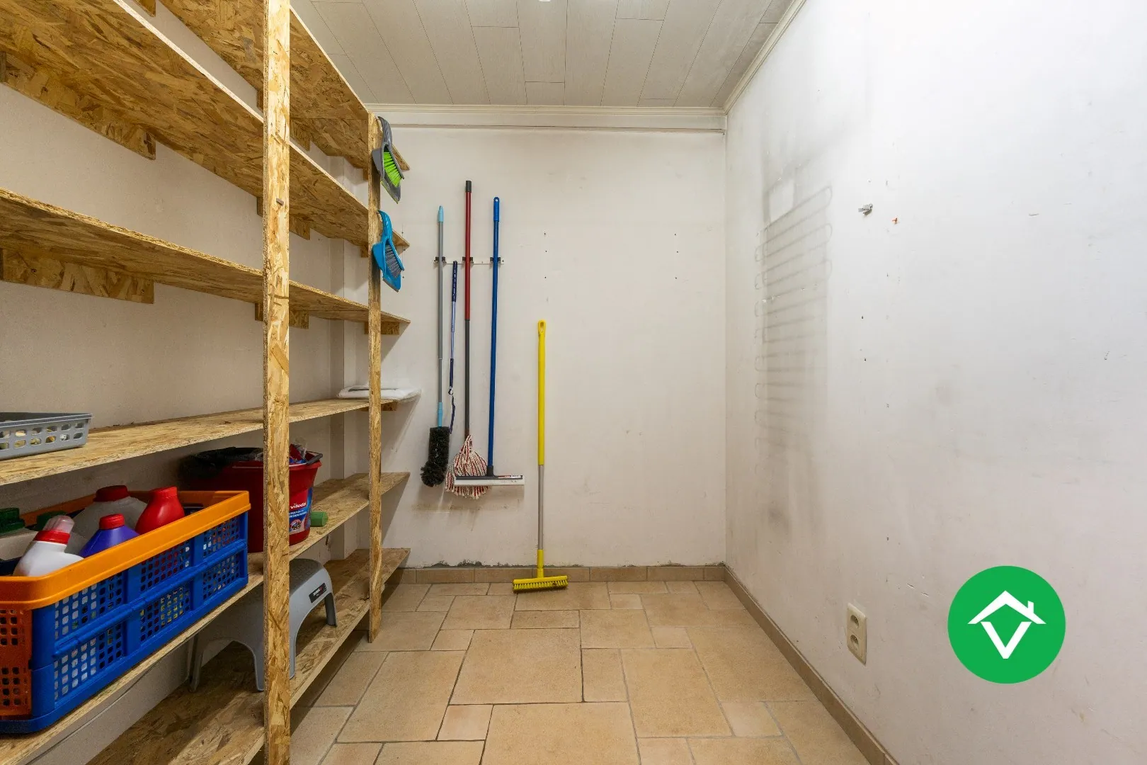 Op het gelijkvloers bevindt zich de hoofdwoning, bestaande uit een inkomhal die direct toegang biedt tot de nachthal. Hier bevinden zich twee volwaardige slaapkamers, een praktische bergruimte en een ruime badkamer met zowel een douchecabine als een ligbad. De lichtrijke leefruimte met open keuken biedt een prachtig uitzicht op de uitgestrekte, groene tuin.