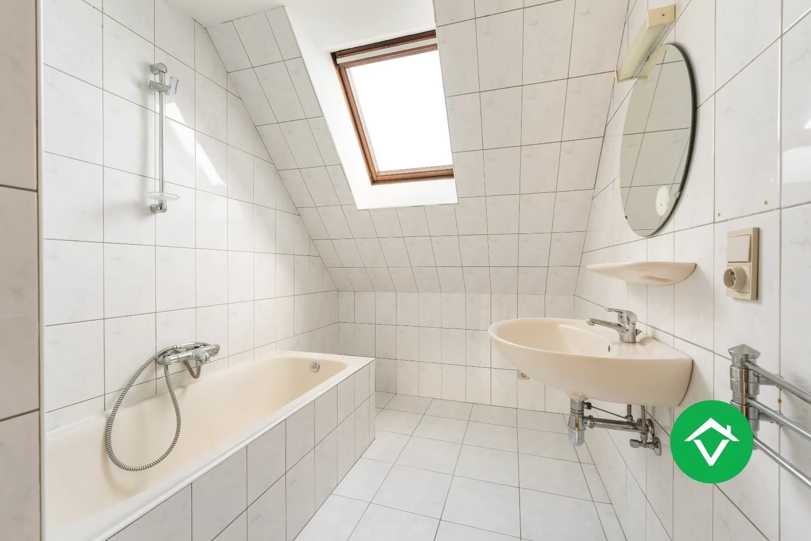 Het appartement op de bovenverdieping beschikt over een charmante woonkamer met een aansluitende ingerichte keuken. Op deze verdieping vindt u ook een gastentoilet en de mogelijkheid om een dakterras in te richten. Via een vaste trap bereikt u de ruime nachthal, die toegang geeft ... tot drie slaapkamers en een badkamer. Deze nachthal kan ook worden omgevormd tot een extra slaapkamer met dressing. Het appartement heeft een apart energieprestatiecertificaat met energielabel F en een energiescore van 638 kWh/(m² jaar).