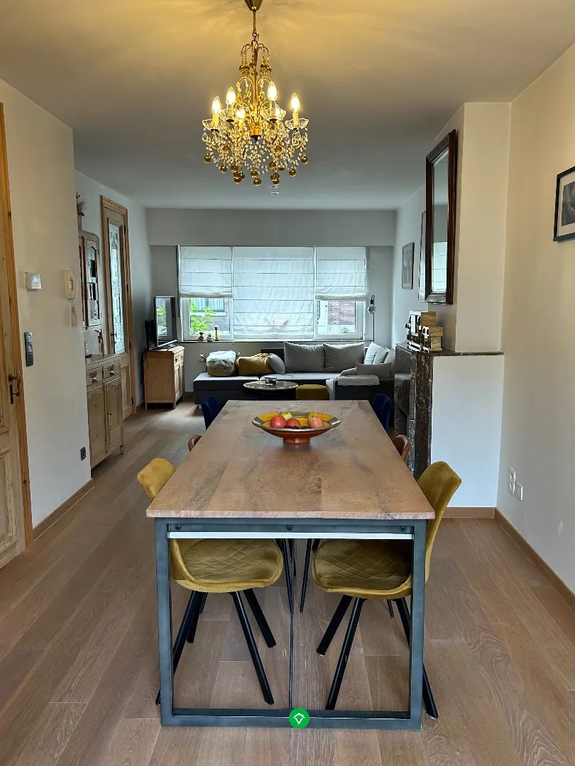 De indeling is als volgt: inkomhal - apart toilet - lichtrijke living (authentieke schouw - parket) - uitgeruste, open keuken - badkamer (douche, ligbad en badkamermeubel) - stadstuintje/koer - kelder (over de volledige oppervlakte van de woning onderkelderd).