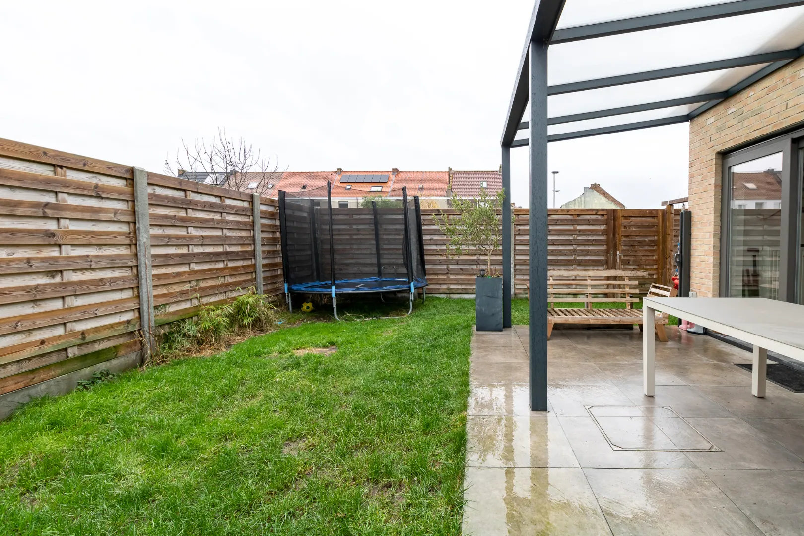 inkomhal met toilet - lichtrijke woonkamer met toegang tot de tuin - open keuken - wasberging - terras - tuin - carport.