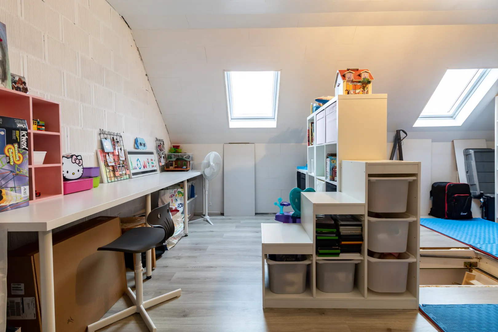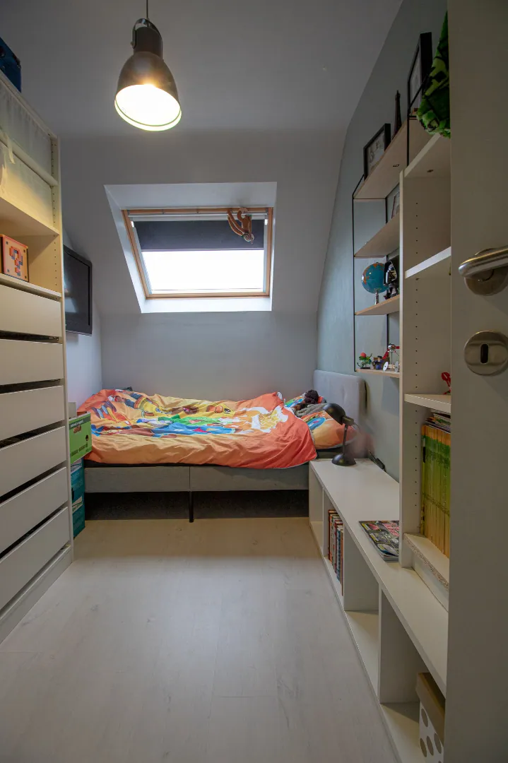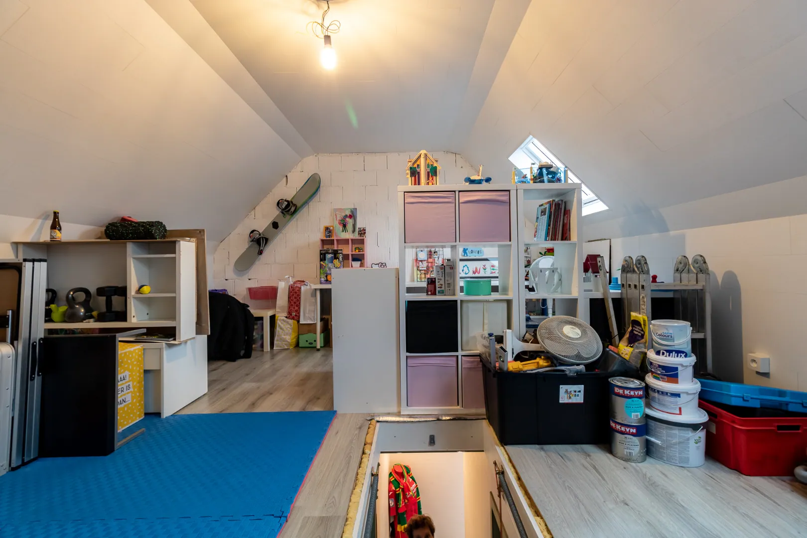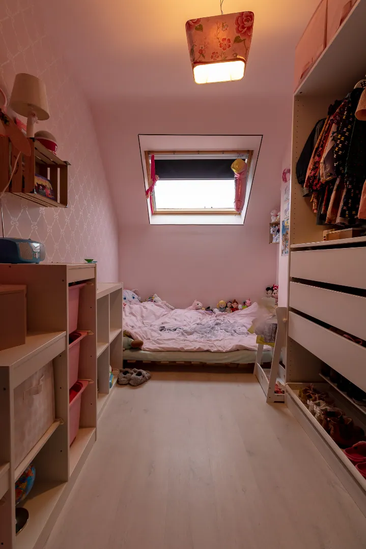 Zolder is afgewerkt, voorzien van dakvensters, wordt momenteel gebruikt als bergruimte/ hobbykamer.