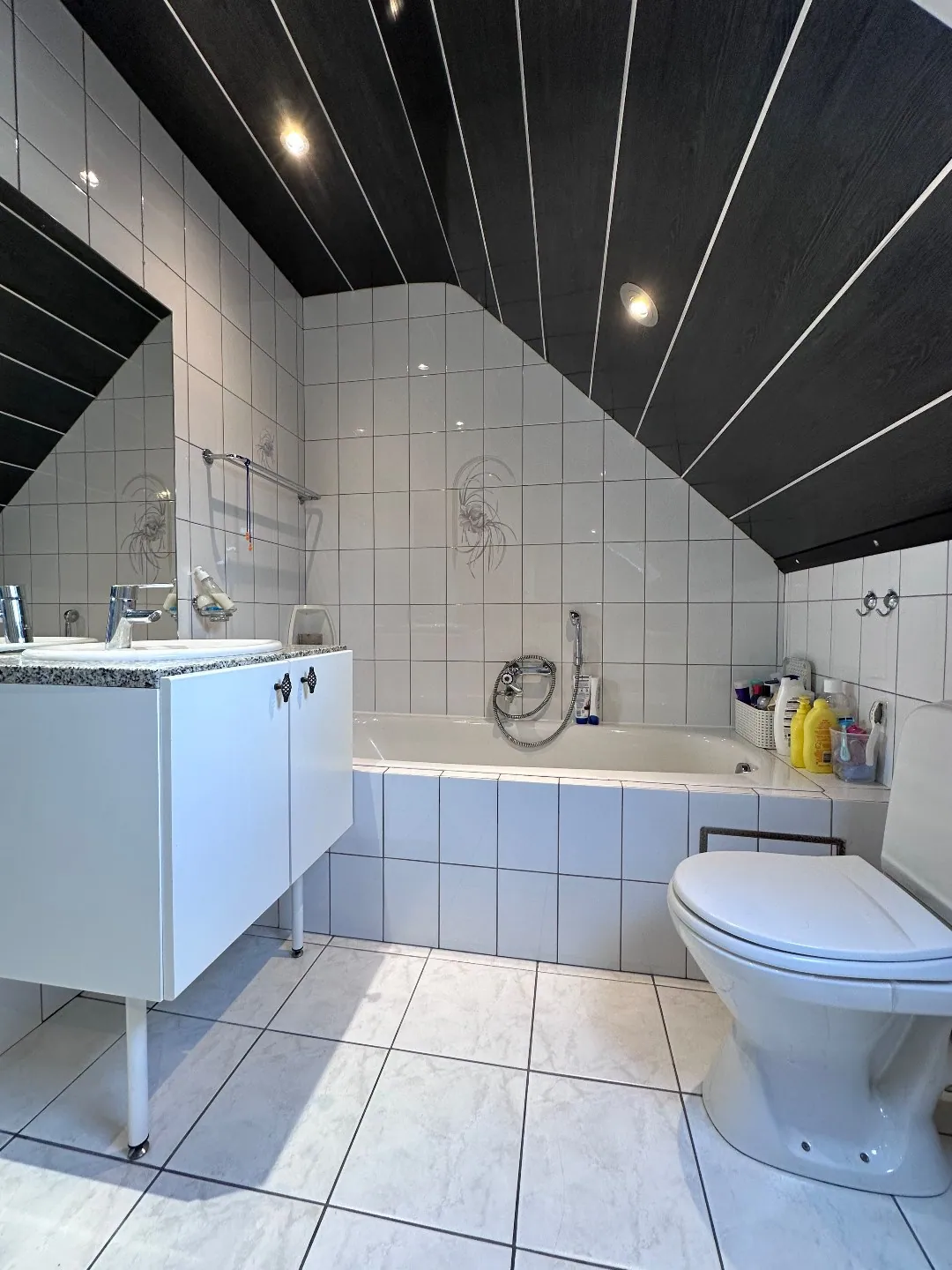Op 1ste verdieping: nachthal - 3 slaapkamers - badkamer met ligbad, douche en toilet - zolder.