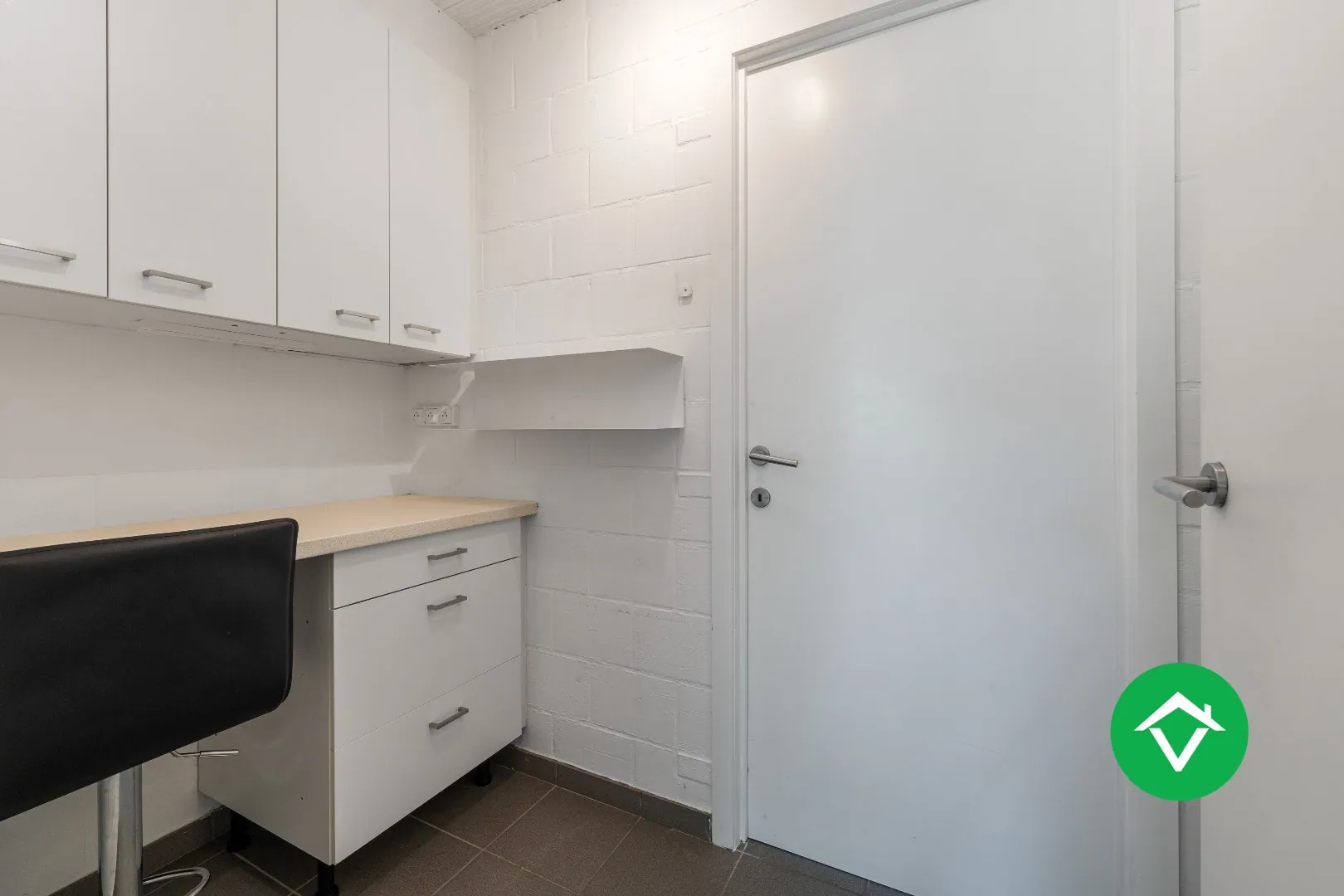 Op het gelijkvloers: mooie oprit met plaats voor twee wagens en een voortuin - inkomhal met afzonderlijk hangtoilet - traphal - ruime lichtrijke living met inbouwkasten, lamellen en gordijnen - volledig ingerichte keuken ( afwasbak, vaatwasser, oven, microgolfoven, keramische kookplaat, koelkast en dampkap) met een aansluitende lichtrijke eethoek/veranda die voorzien is van zonnewering en waar u kunt genieten van het mooie zicht op de tuin - bureau met inbouwkasten - berging/wasplaats - garage die voorzien is van inbouwkasten en een geautomatiseerde poort. De tuin is volledig afgesloten en uitgerust met een mooi terras, een tuinhuis, een afgesloten fietsenberging.