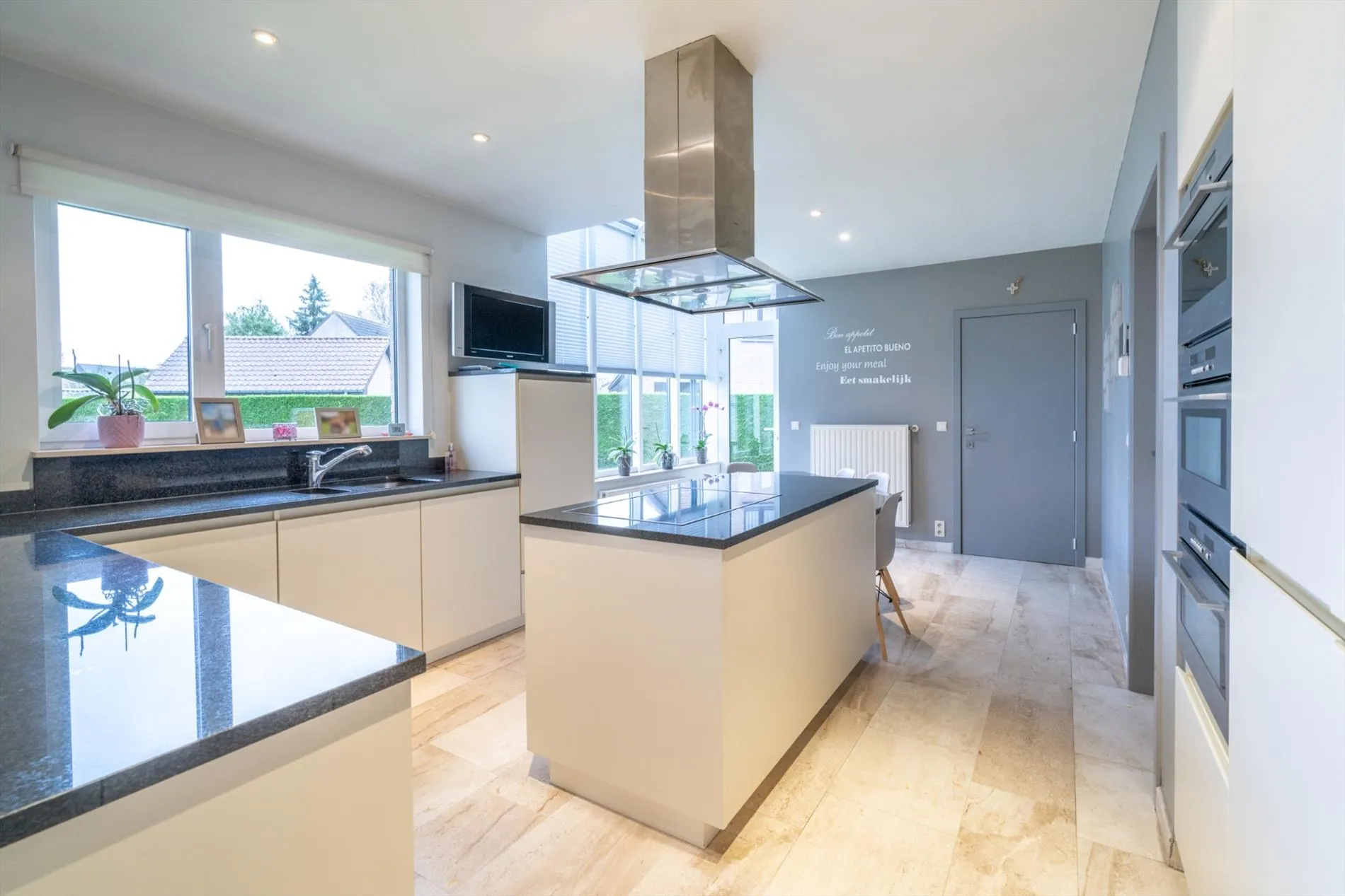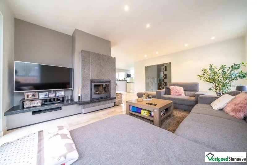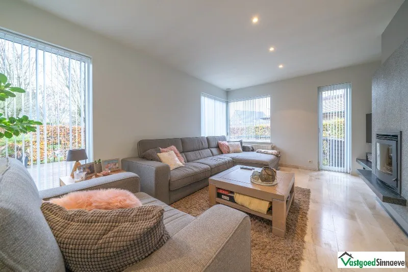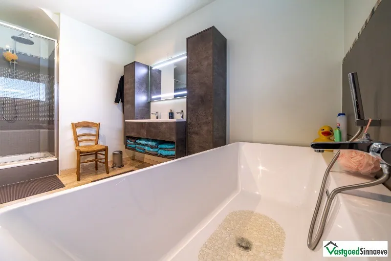 Op het gelijkvloers : ruime inkomhal - afzonderlijk toilet - lichtrijke leefruimte met salon - eetkamer - open keuken voorzien van alle inbouwtoestellen en ontbijthoek. - berging - wasplaats - badkamer met ligbad, douche en dubbele lavabo - dubbele garage - ruim terras met zonneluifel met regen- en zonnesensor - zonnige tuin - tuinhuis - extra gezellig terras aan de voorkant van de woning - ruime houtberging - oprit.