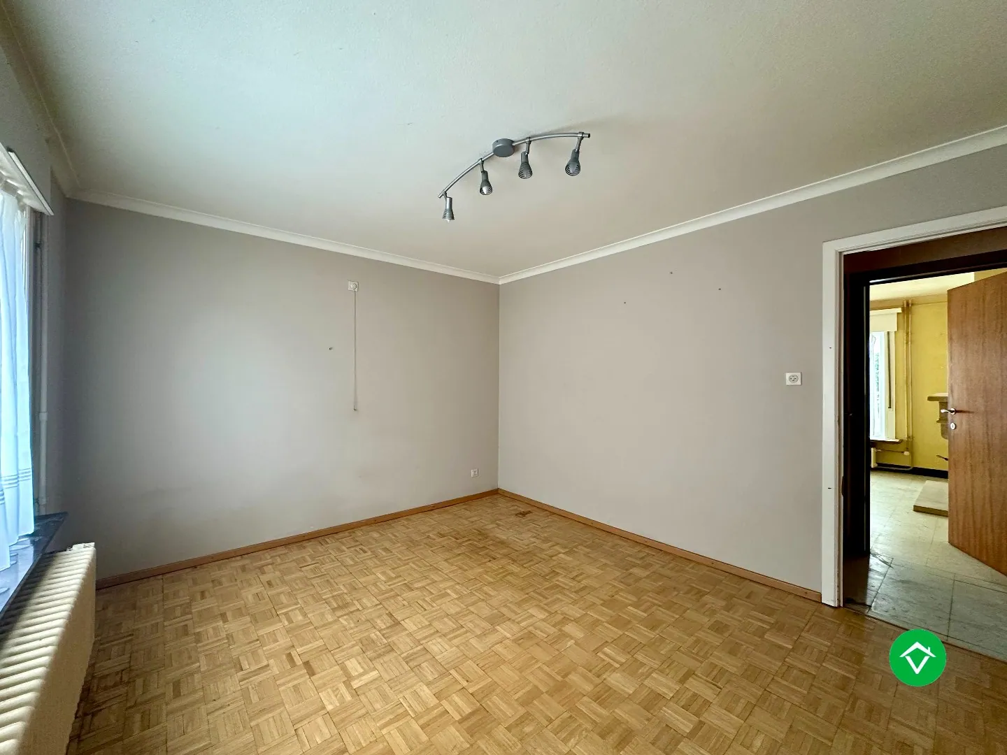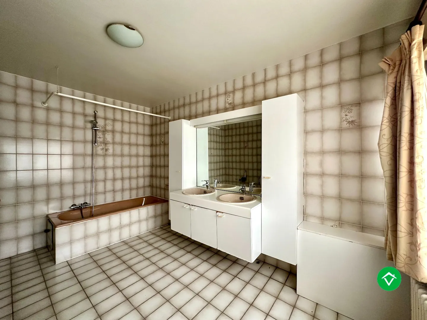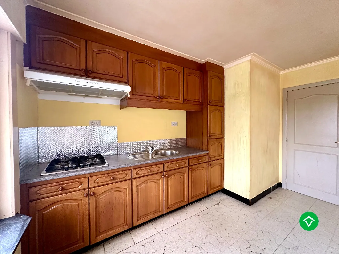 Via de inkomhal komt u in de lichtrijke woonkamer met plaats voor zowel een zit- als eetruimte. Aansluitend bevindt zich de ruime keuken met mogelijkheid tot eethoek. Op het gelijkvloers vindt u verder de badkamer (uitgerust met ligbad, toilet en bidet), een handige droge nis en twee ruime slaapkamers.