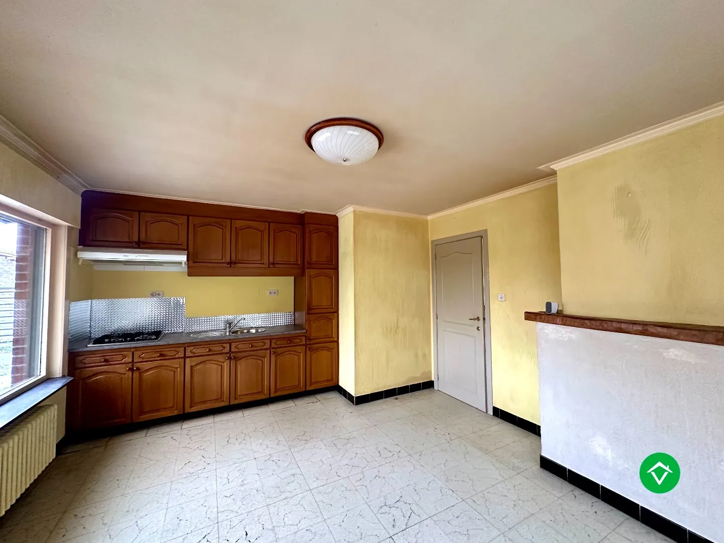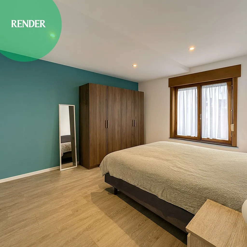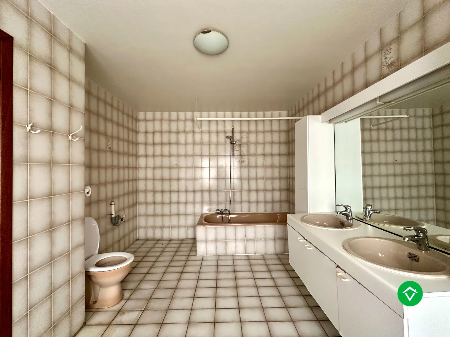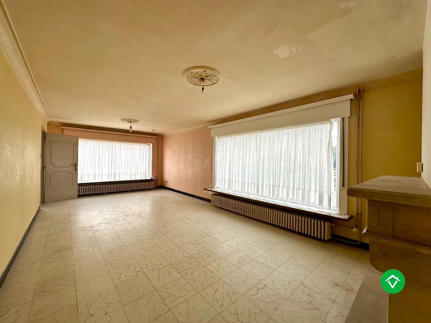Via de inkomhal komt u in de lichtrijke woonkamer met plaats voor zowel een zit- als eetruimte. Aansluitend bevindt zich de ruime keuken met mogelijkheid tot eethoek. Op het gelijkvloers vindt u verder de badkamer (uitgerust met ligbad, toilet en bidet), een handige droge nis en twee ruime slaapkamers.
