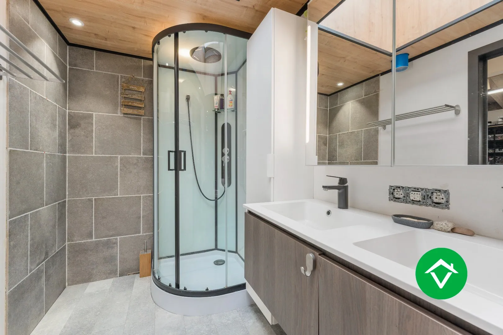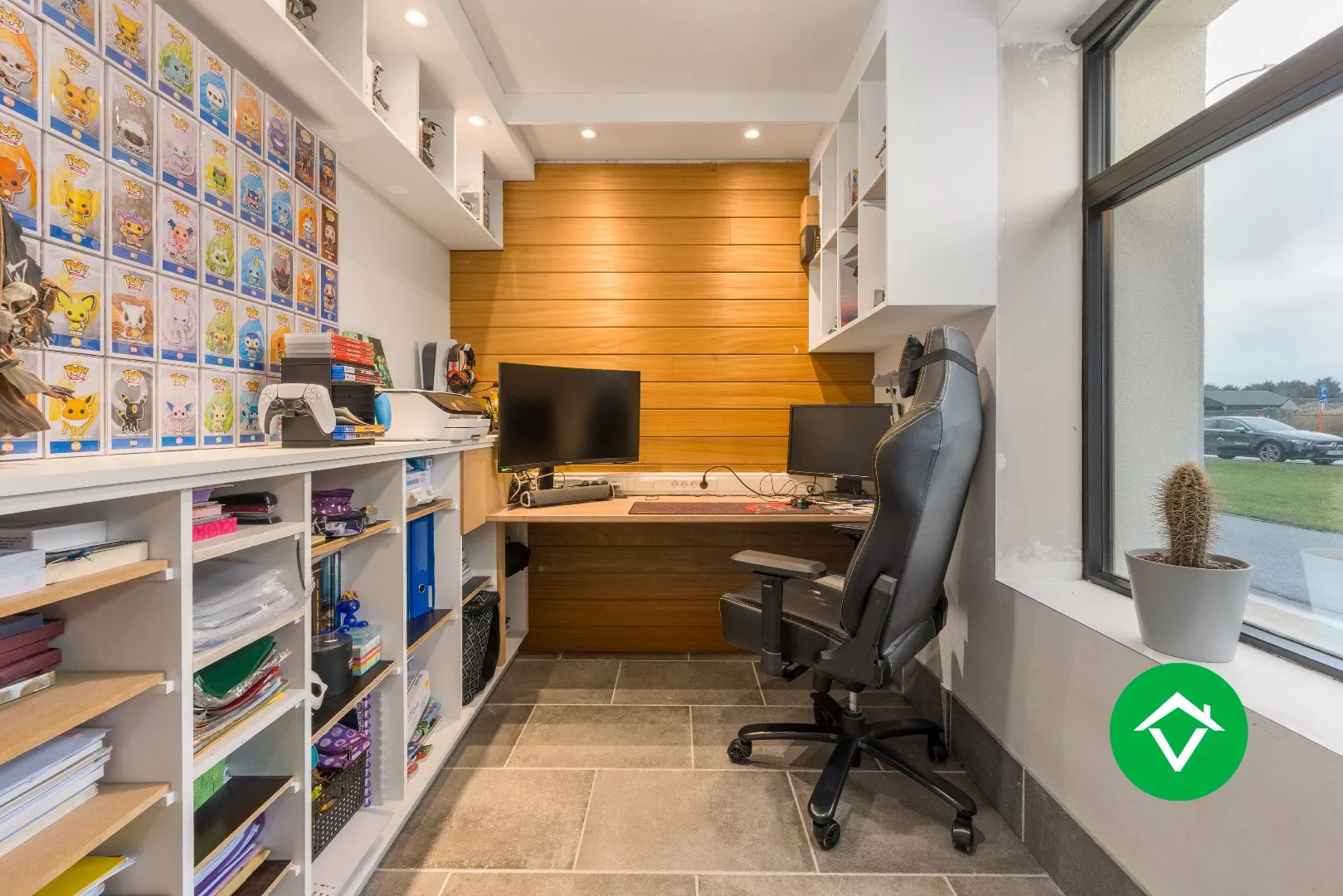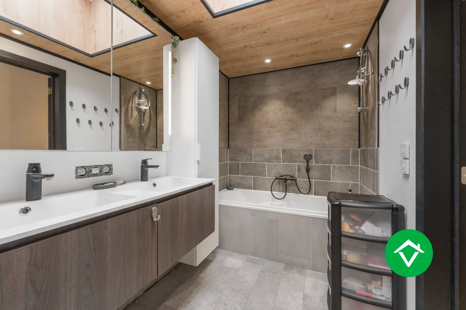 Op het gelijkvloers geniet u van een open leefruimte van 45 m² met zicht op de tuin. De moderne, volledig ingerichte keuken is uitgerust met hoogwaardige toestellen: dubbele combi-oven, inductiekookplaat, vaatwasser, dampkap en spoelbak. Aansluitend vindt u een praktische bureelhoek en een discreet weggewerkte technische berging. Verder beschikt deze verdieping over een ruime badkamer met ligbad, douchecabine en lavabomeubel, een aparte wasruimte, gastentoilet en extra berging.