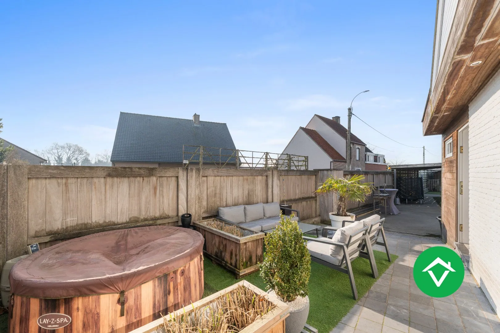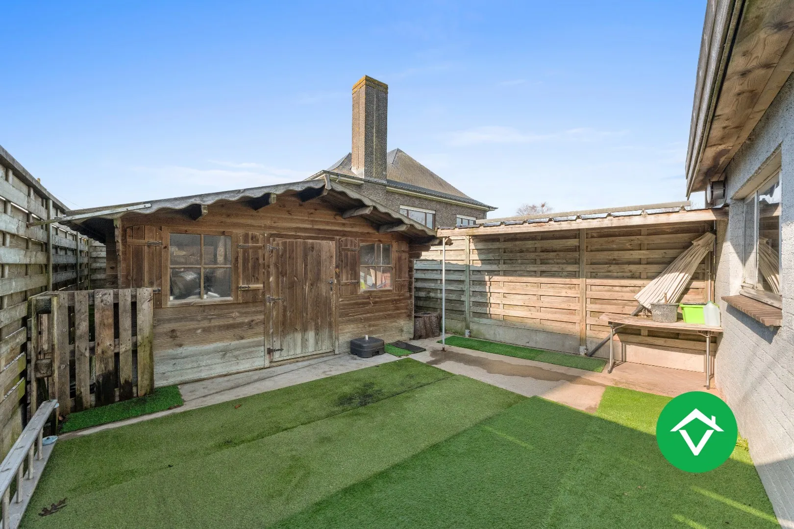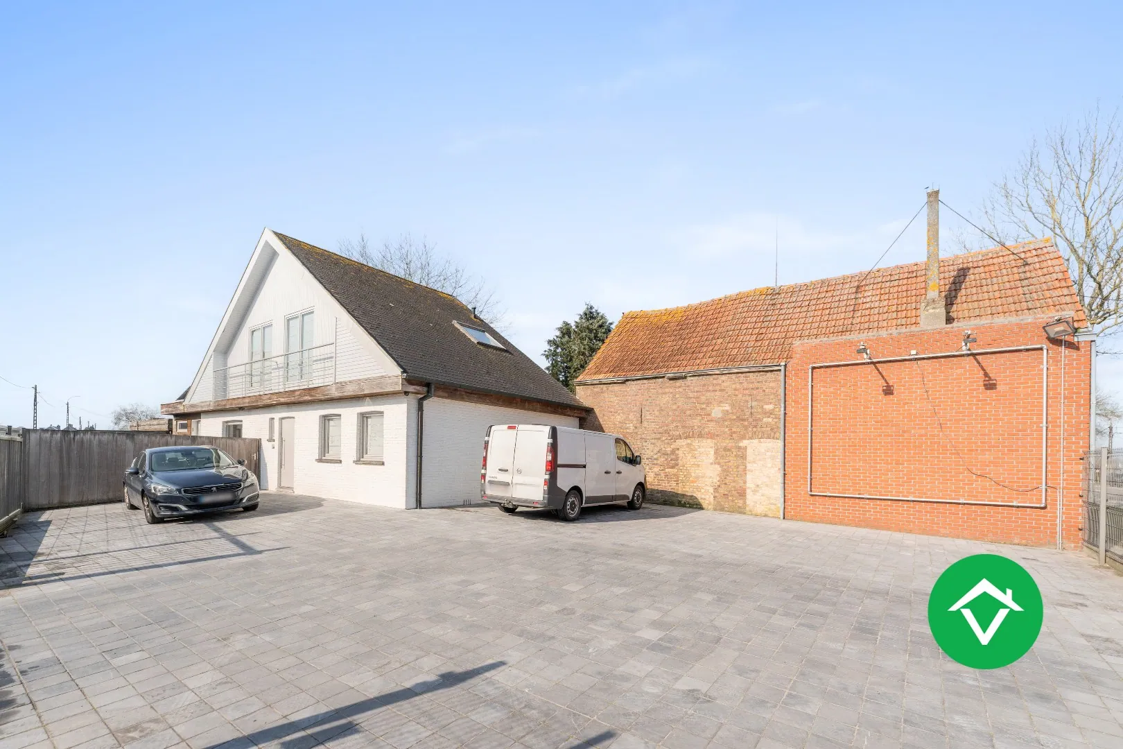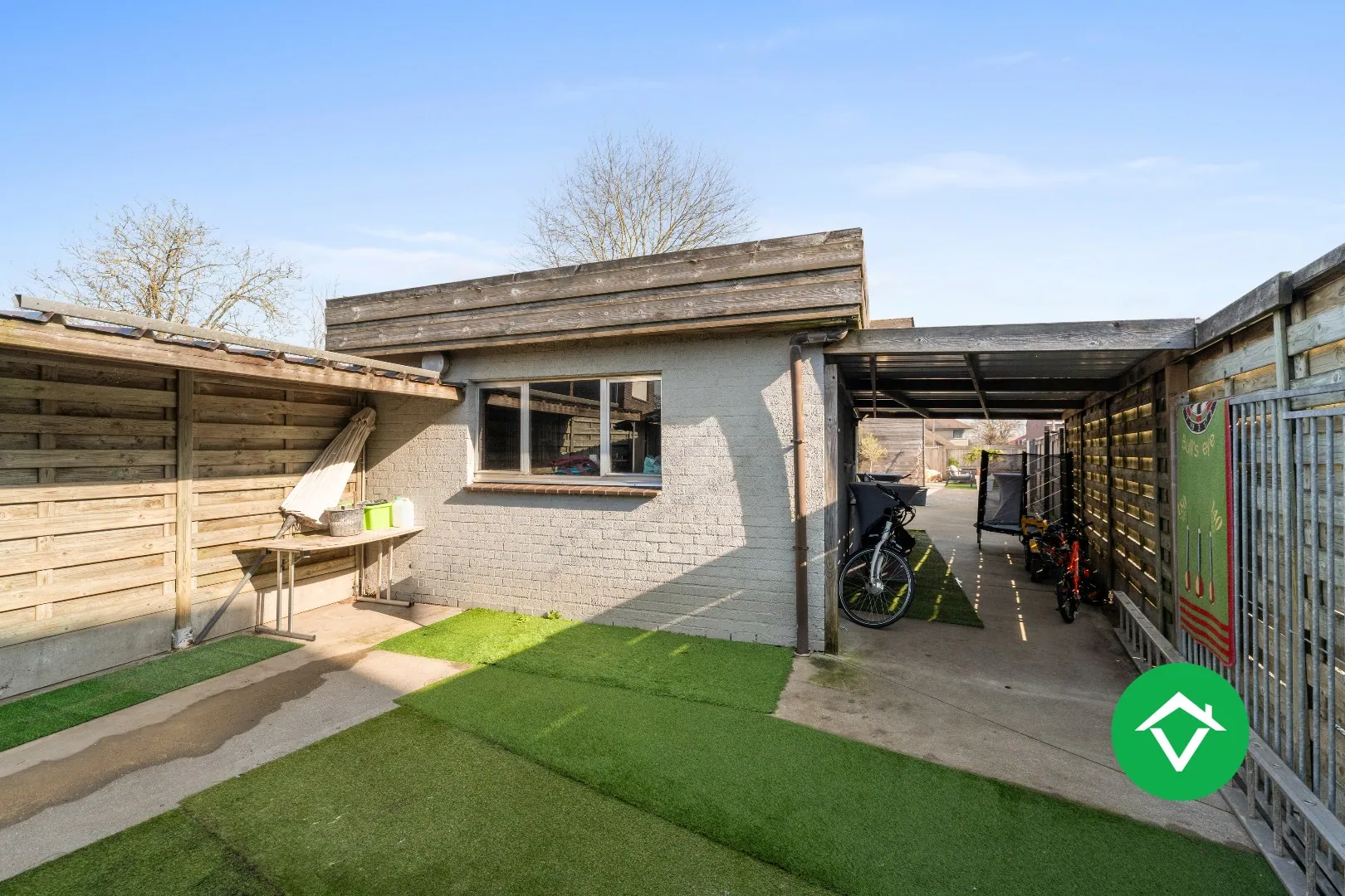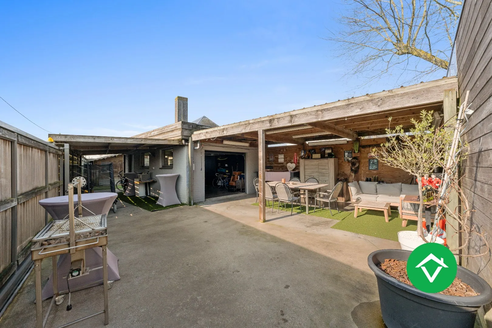 Buiten beschikt de eigendom over een garage en een overkapping, aangevuld met meerdere opritmogelijkheden vooraan. Dit zorgt voor bijzonder veel parkeerruimte voor bewoners en bezoekers.