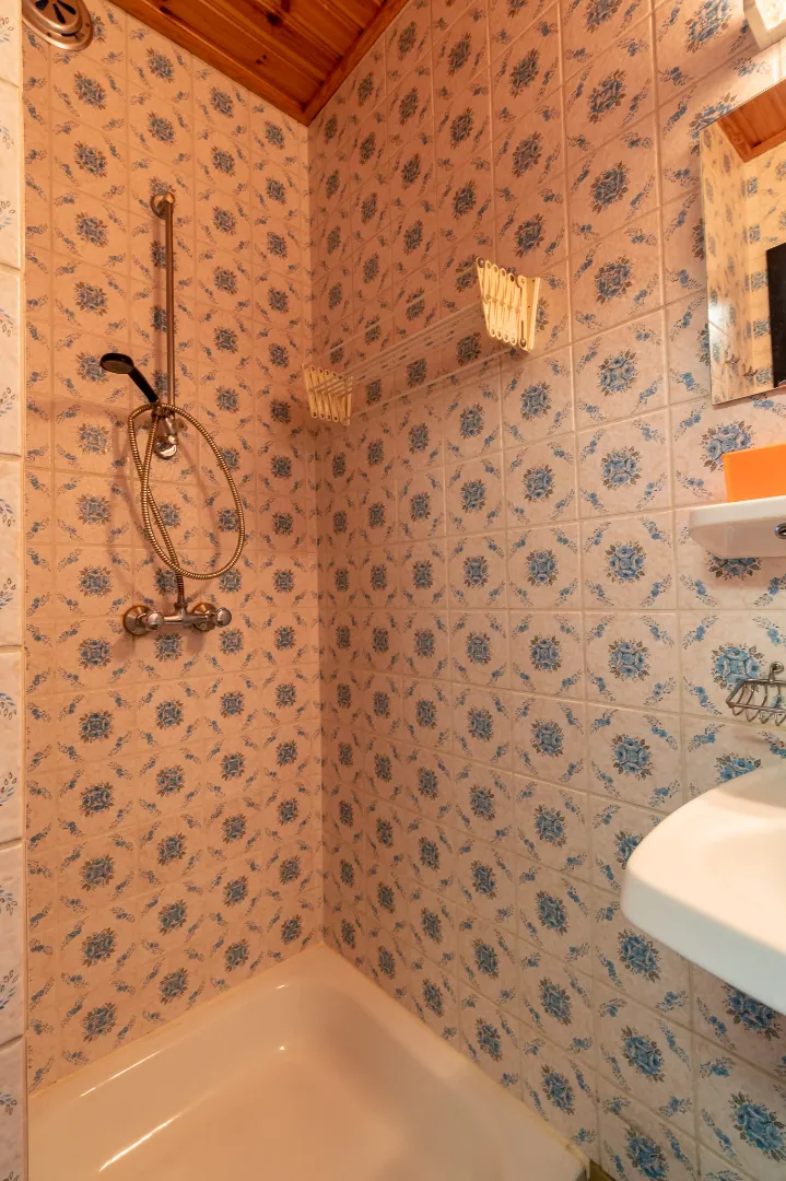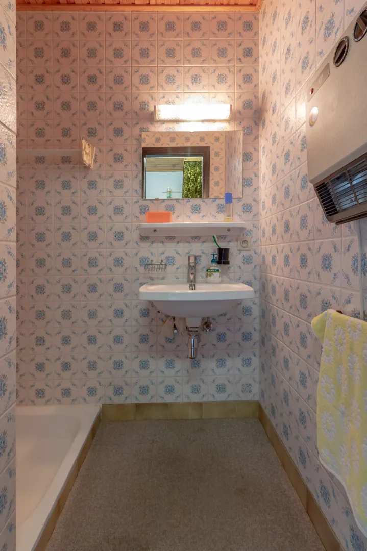Deze alleenstaande woning bevindt zich op een grondoppervlakte van 696m² en is al volgt ingedeeld : inkomhal - woonkamer met keuken - zonrijke veranda - berging - 2 slaapkamers - badkamer met douche - afzonderlijk toilet - wasplaats - berging.