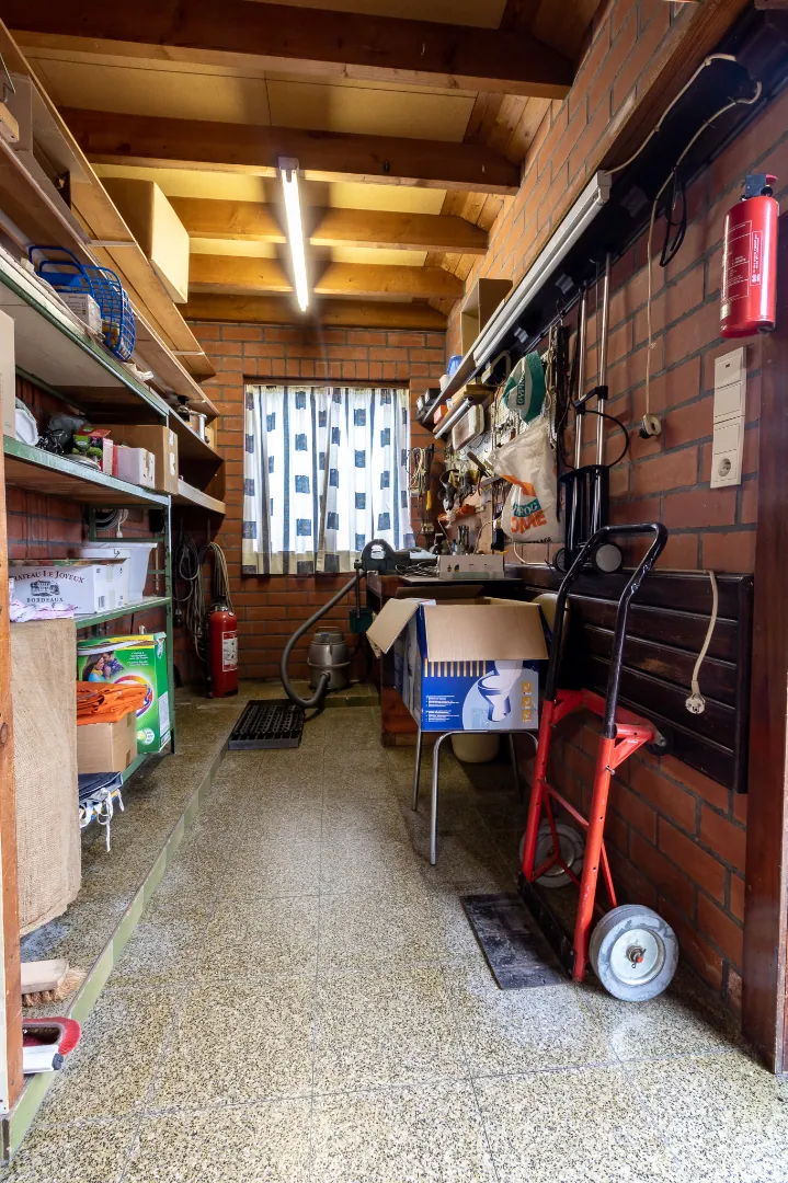 Daarnaast beschikt de woning over een uitzonderlijk ruime garage die eventueel kan omgebouwd worden tot extra woonruimte/ slaapkamer. Via de garage bereikt men de zolder, deze kan alsook omgebouwd worden tot extra slaapkamers, momenteel al 1 slaapkamer aanwezig.