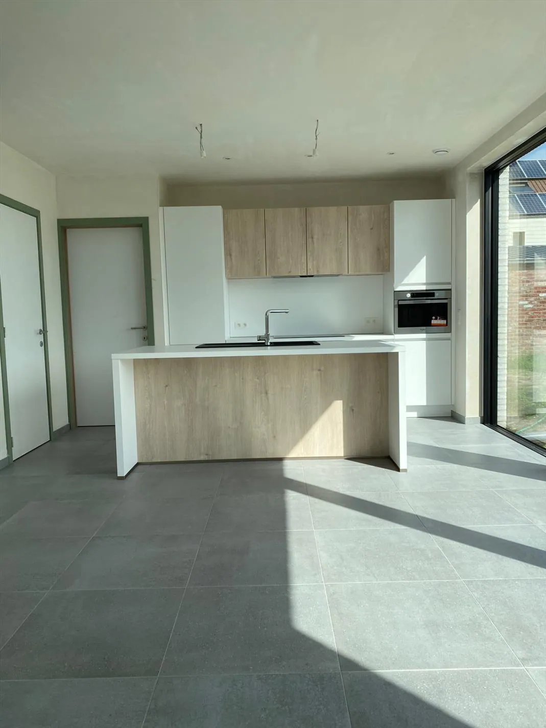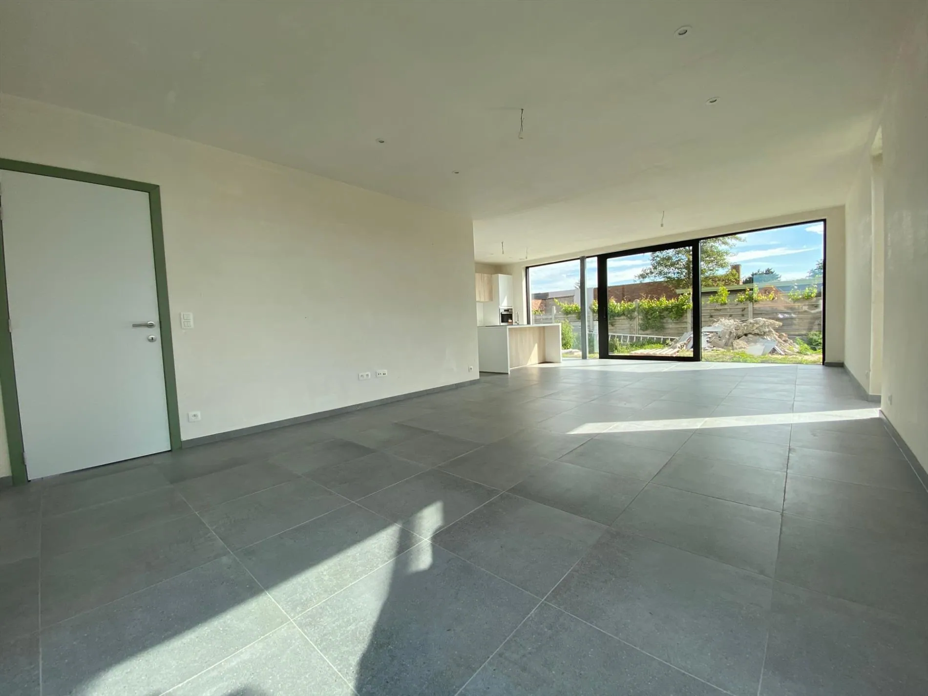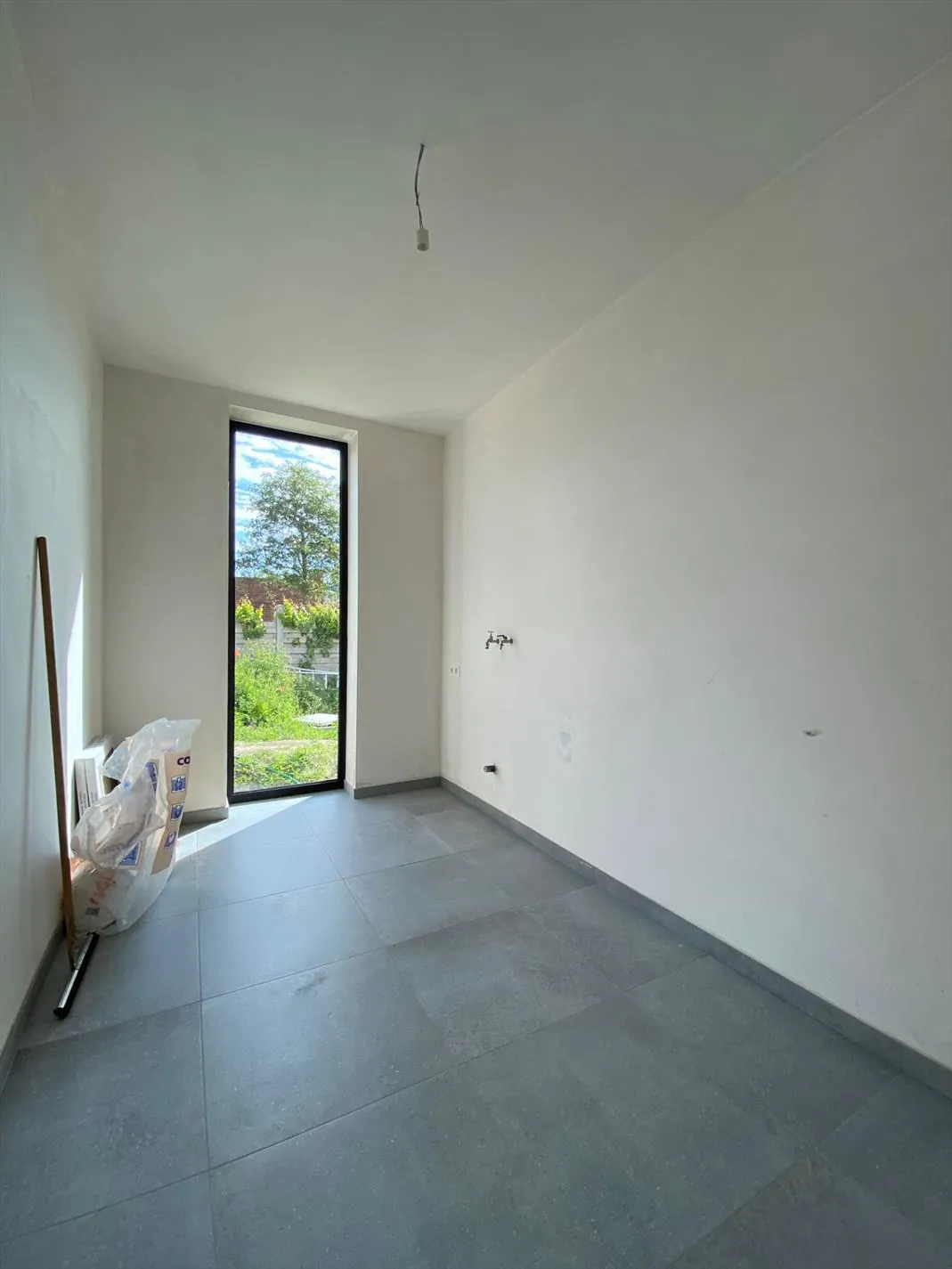 Gelijkvloers: inkomhal - gastentoilet - bureau - lichtrijke living met open ingerichte keuken - berging - wasplaats.