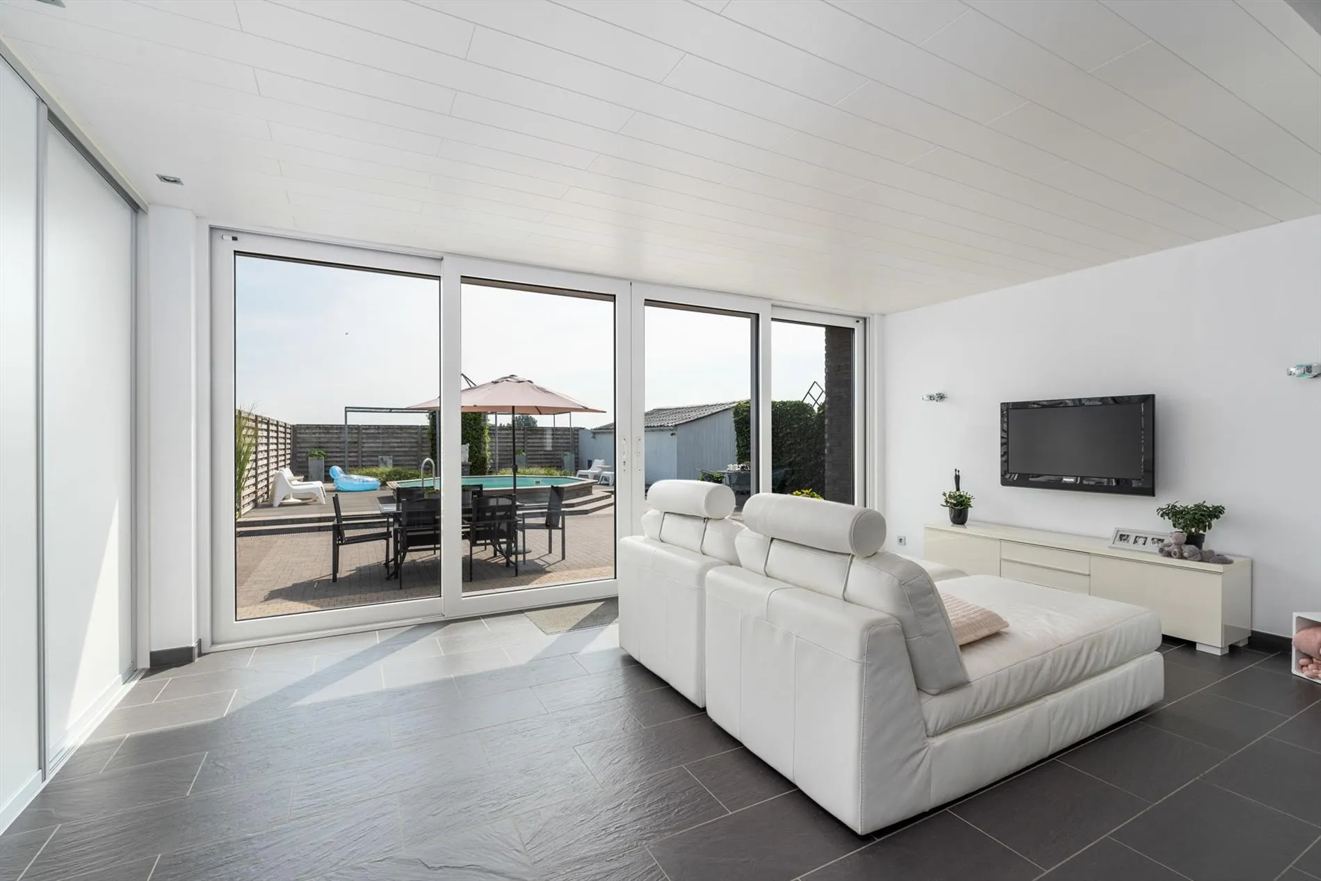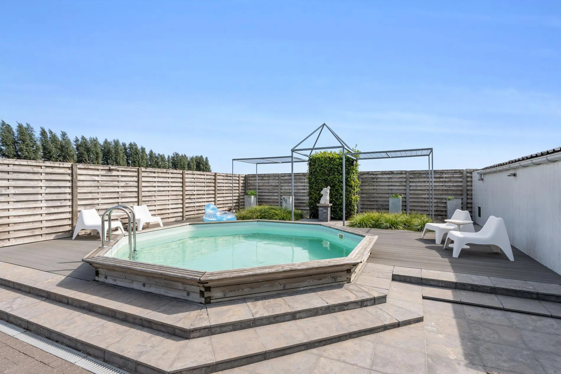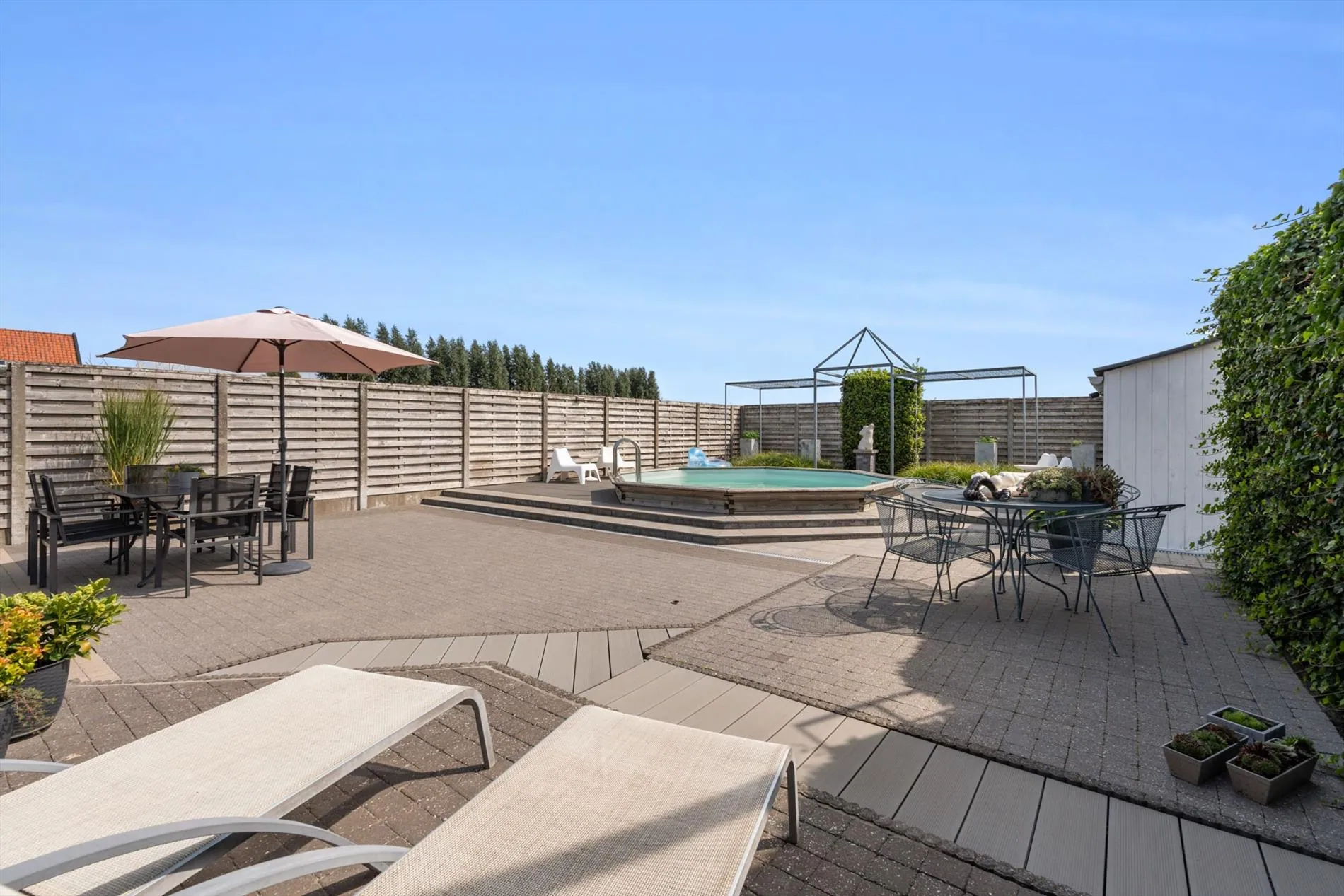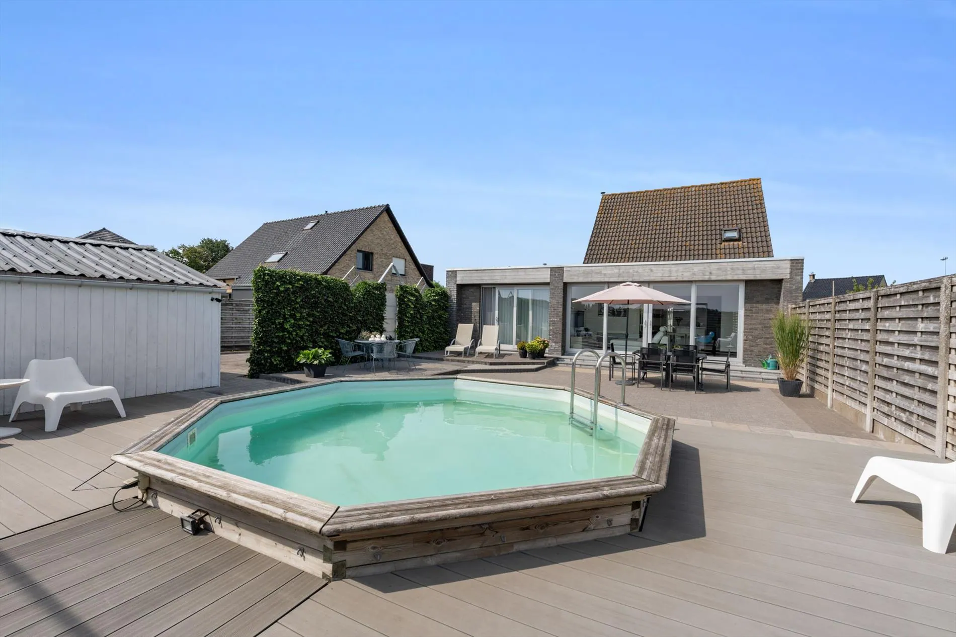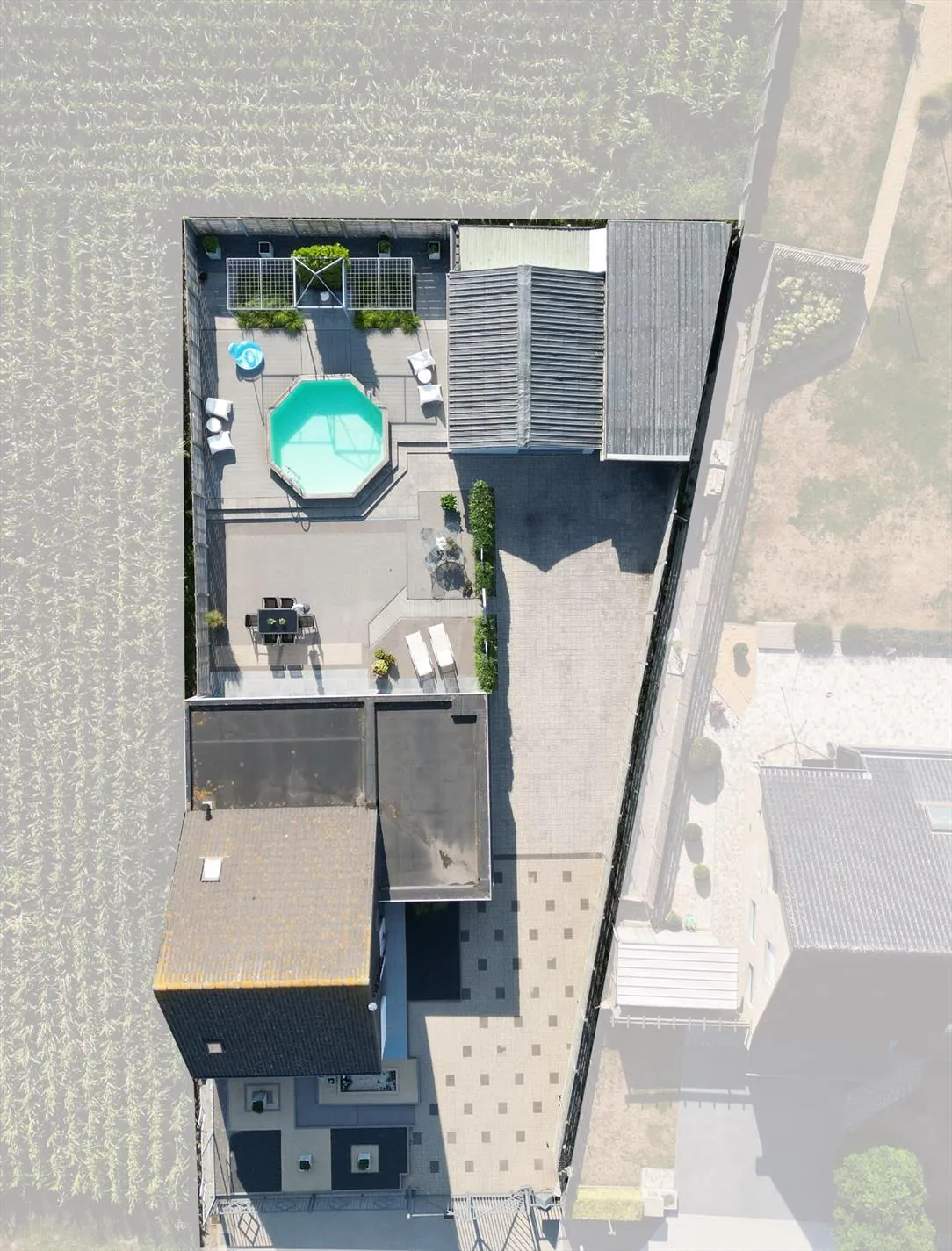 grote oprit - inkomhal met vestiaireruimte - toilet - living - grote keuken - berging - wasplaats - zitruimte met zicht op terras - grote garage - carport - terras - zwembad - 1 slaapkamer op het gelijkvloers met aansluitend een dressingruimte - nachthal - 2 slaapkamers - zolder.