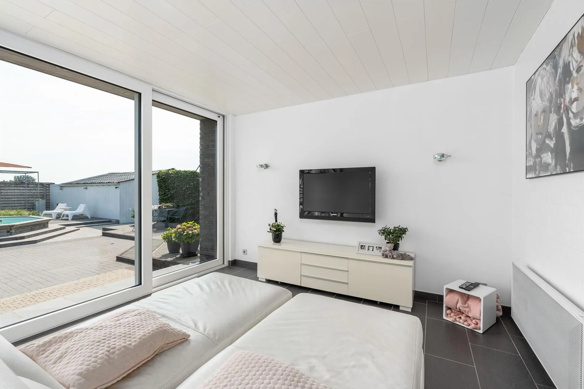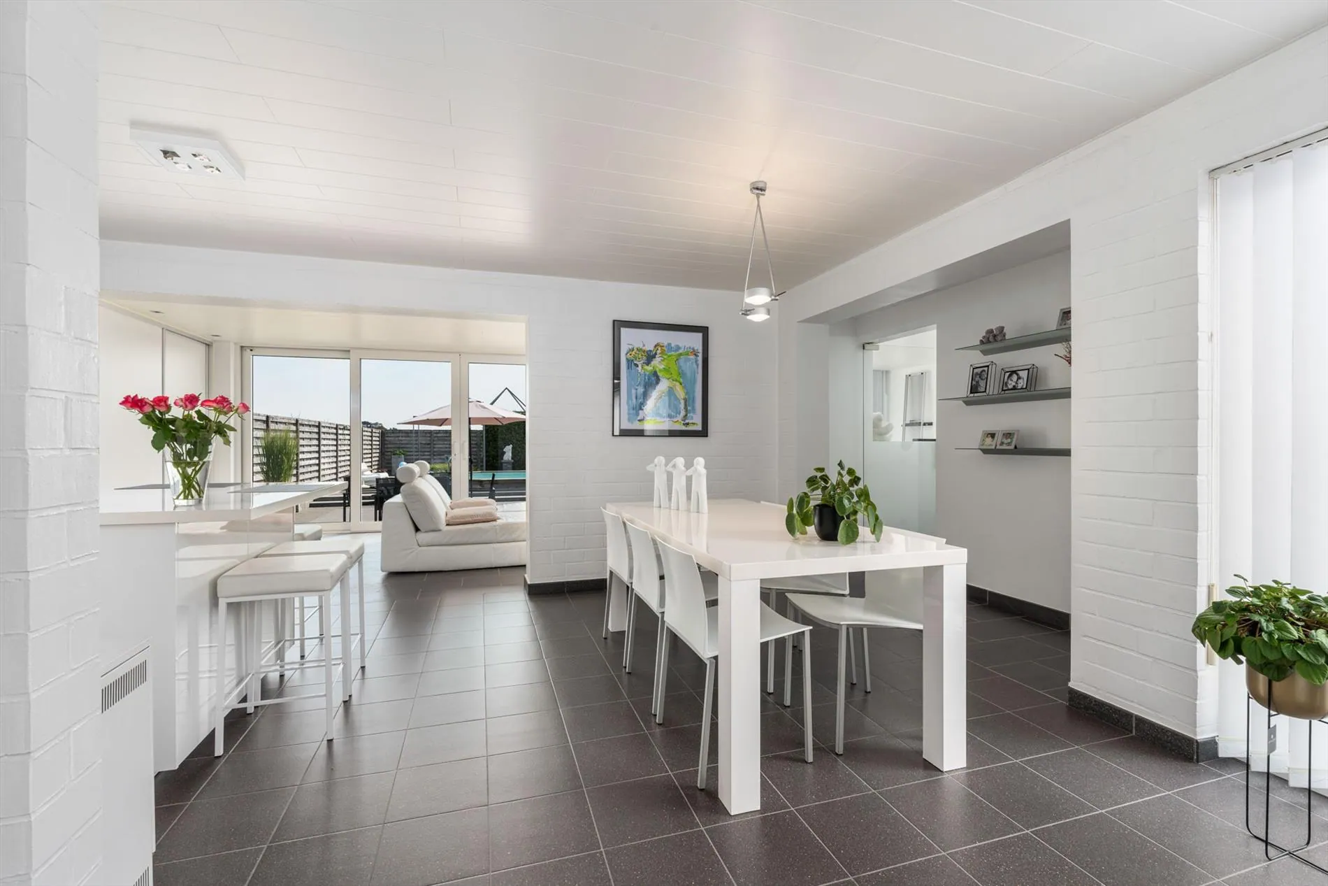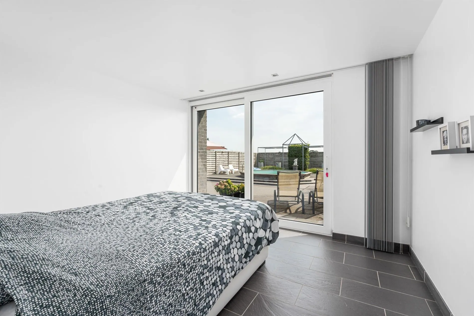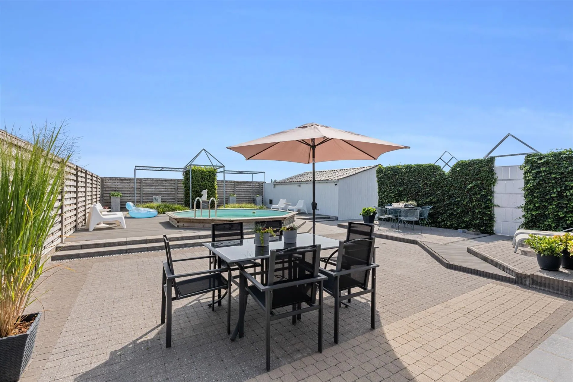 grote oprit - inkomhal met vestiaireruimte - toilet - living - grote keuken - berging - wasplaats - zitruimte met zicht op terras - grote garage - carport - terras - zwembad - 1 slaapkamer op het gelijkvloers met aansluitend een dressingruimte - nachthal - 2 slaapkamers - zolder.