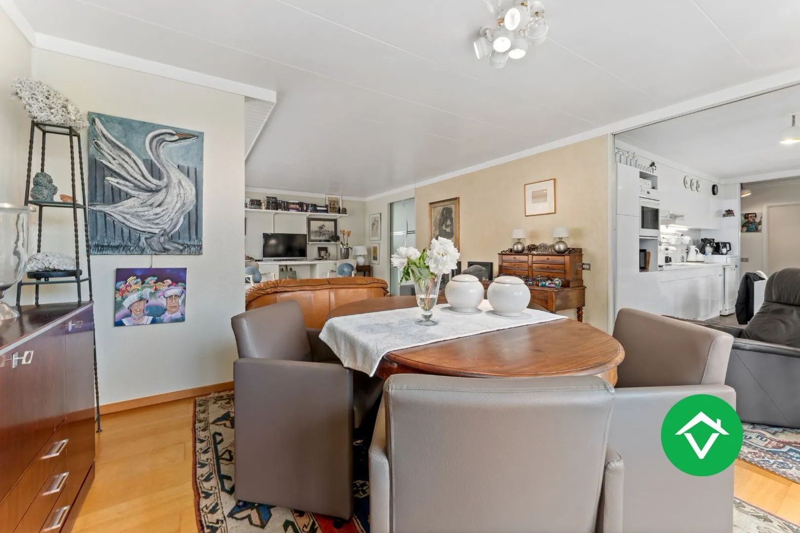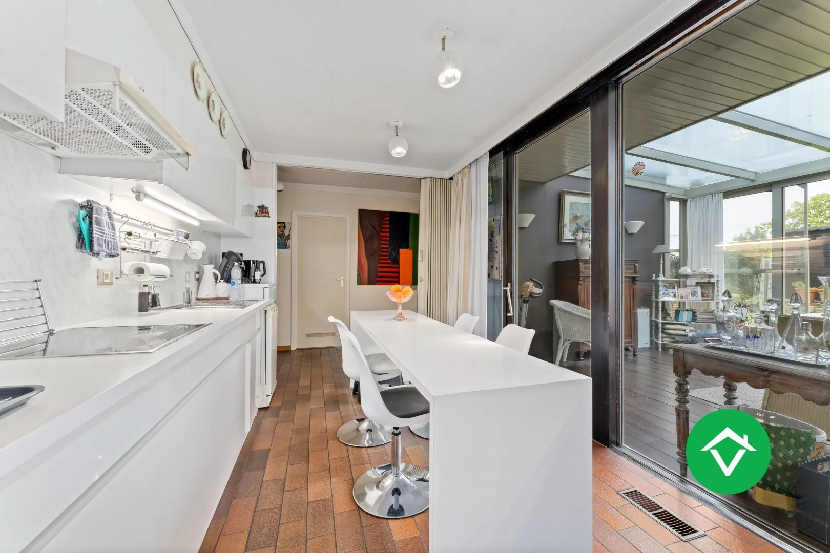 Binnenkomen doet u via de ruime inkomhal met toegang tot de lichtrijke woonkamer via een dubbele glazen deur. De woonkamer met zicht op de groene tuin is ingedeeld als zit- en eetruimte. De grote troef is het invallen van natuurlijk licht via de grote raampartijen. Aansluitend aan de woonkamer ligt de ingerichte keuken die tevens toegang biedt tot de veranda. Via de veranda hebt u via de schuiframen toegang tot de aangelegde tuin.