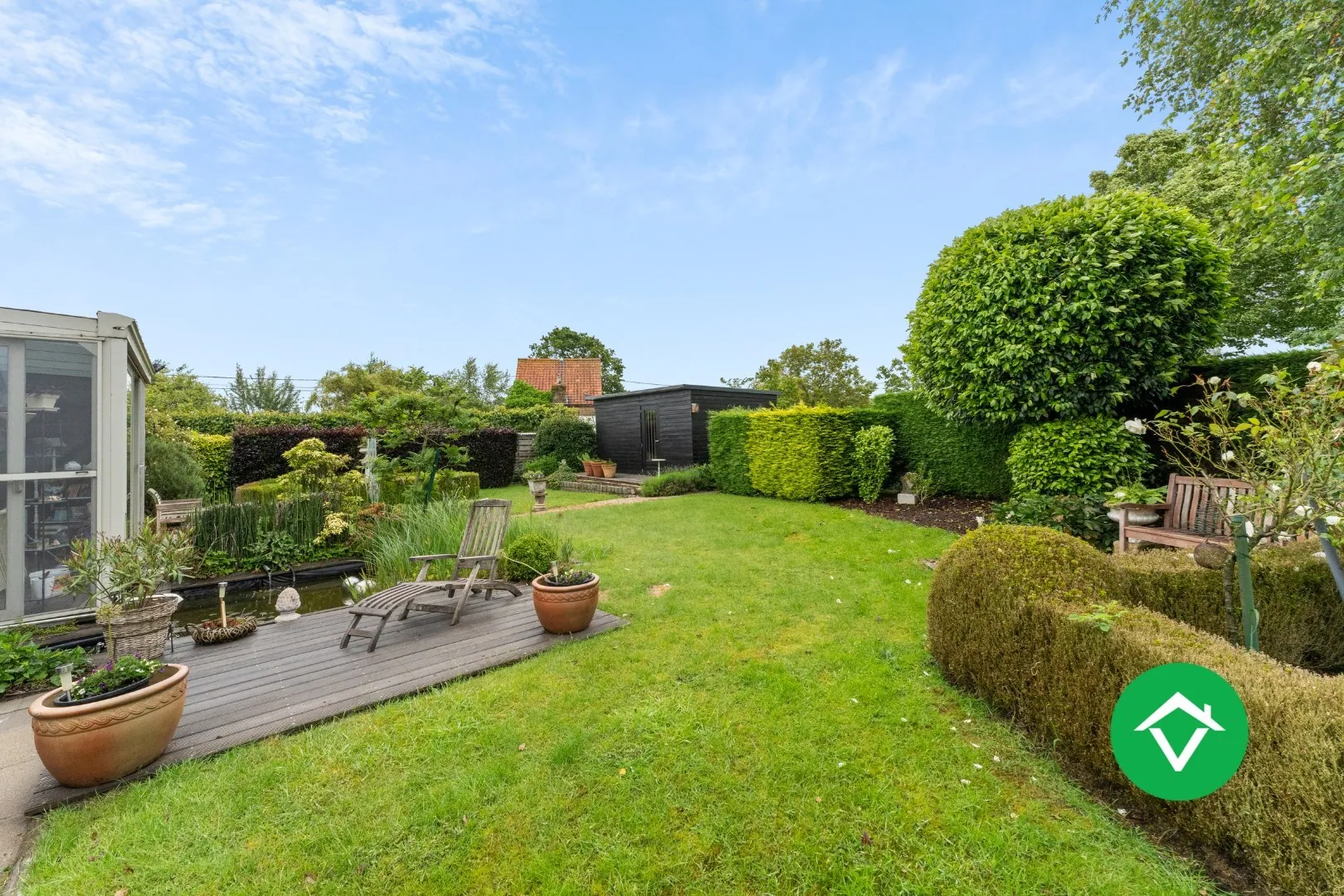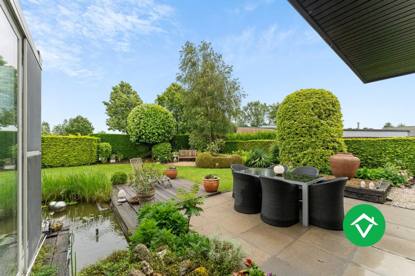 De tuin is fraai aangelegd en beschikt over een ruim tuinhuis, een vijver en meerdere zonneterrassen waar het heerlijk vertoeven is met familie en vrienden. ...