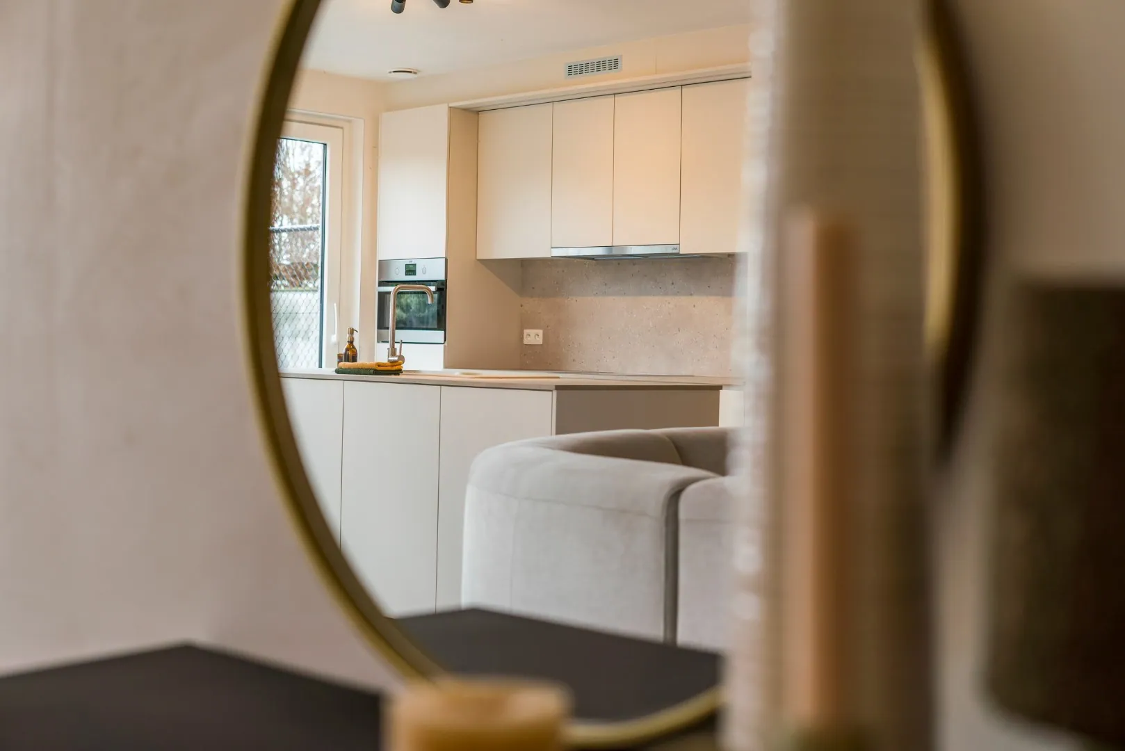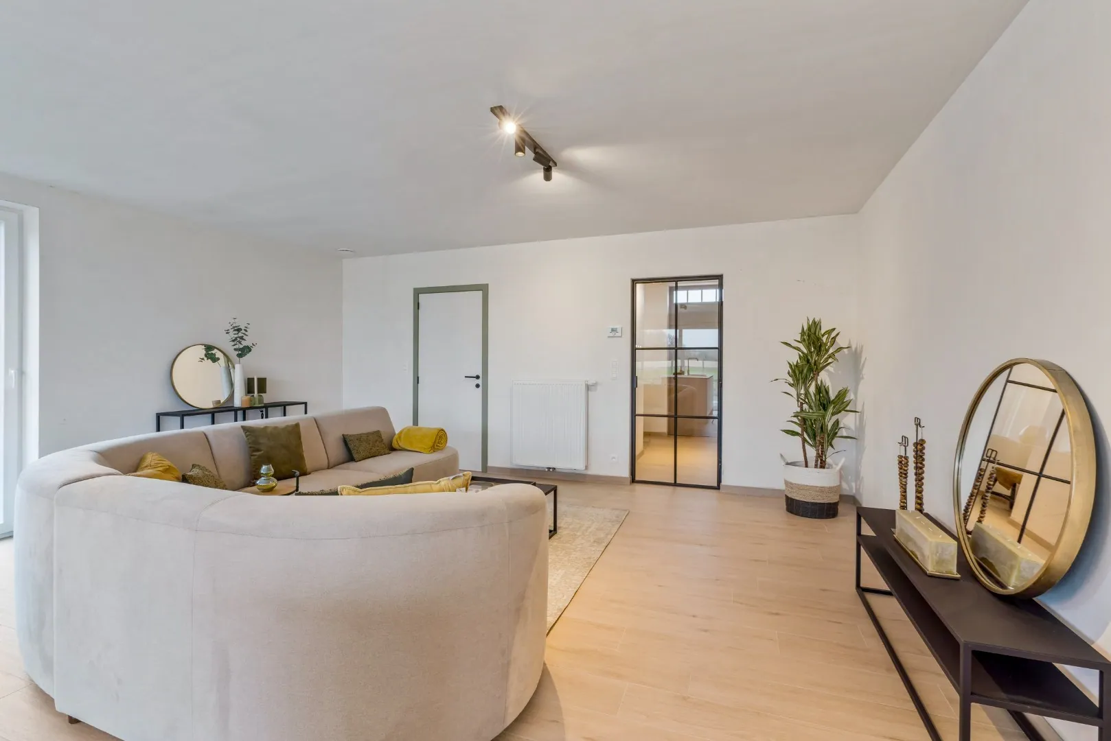 Gelijkvloers: inkomhal - gastentoilet - lichtrijke living met open ingerichte keuken - berging/wasplaats.