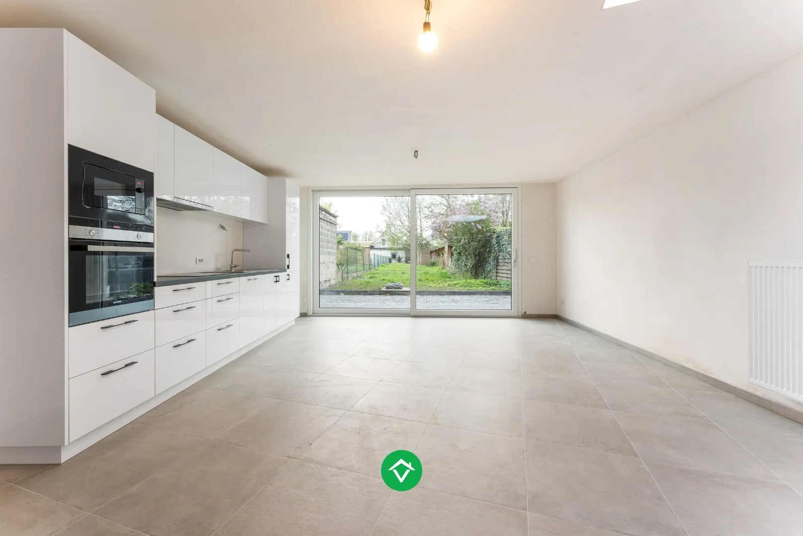 Inkomhal voorzien van gastentoilet, met onmiddellijke toegang tot de lichtrijke woonkamer en open keuken, uitgerust met ingebouwde vaatwasmachine, kookplaat, koelkast, microgolf- en traditionele oven. Vanuit de woonkamer hebt u zicht en toegang tot de groene tuin. Verder op het gelijkvloers bevindt zich de inpandige garage uitgerust met wasruimte.