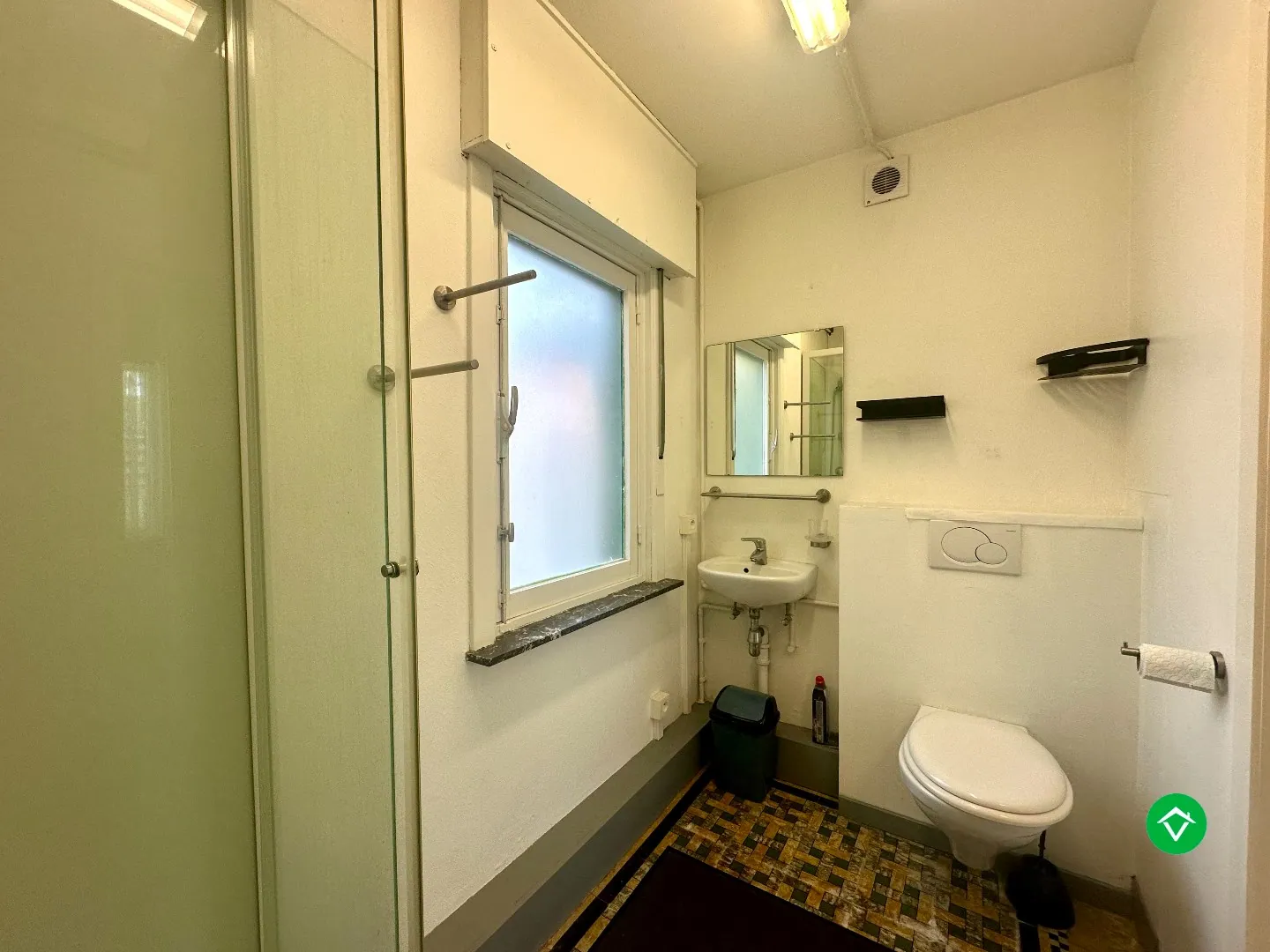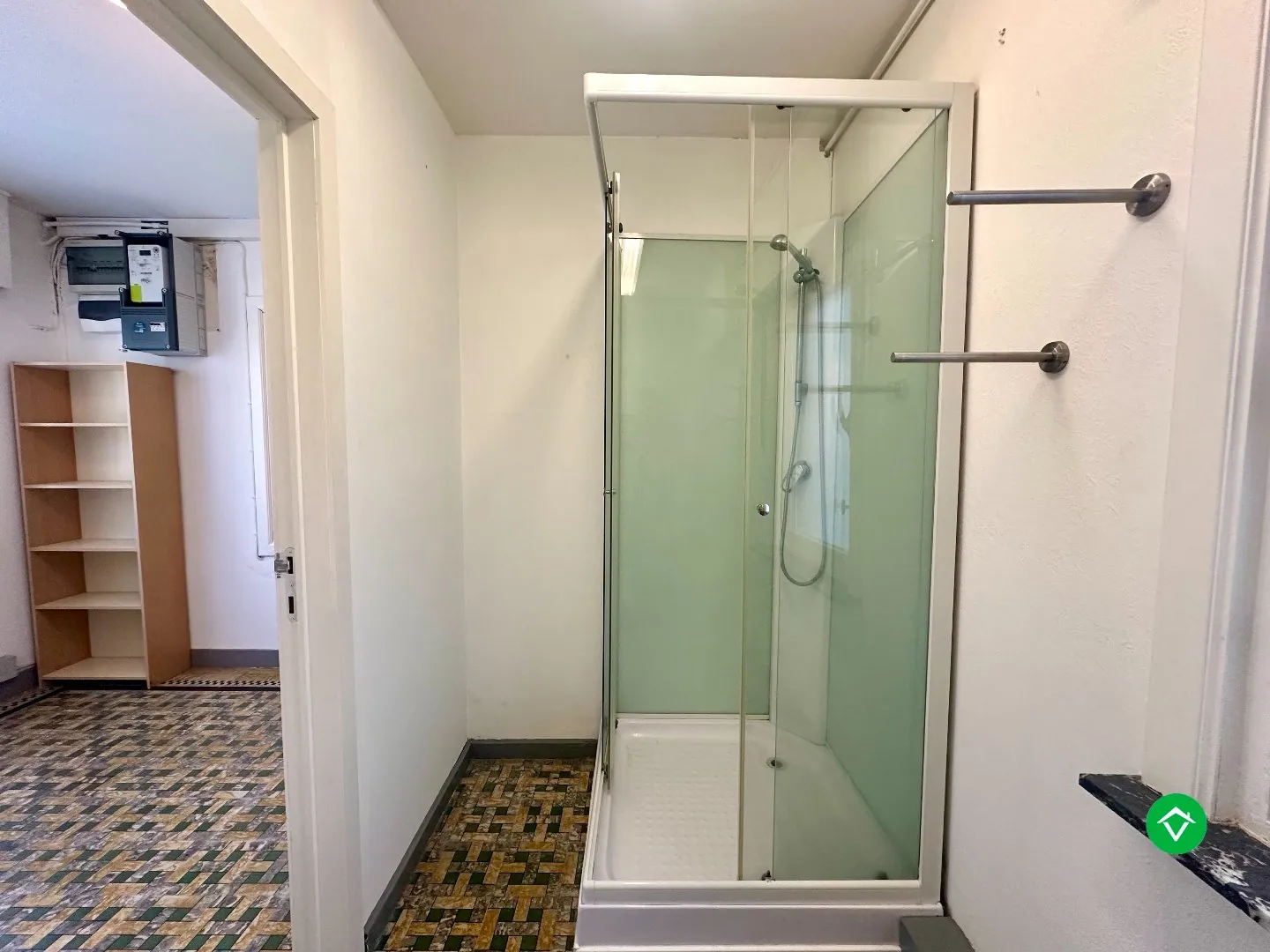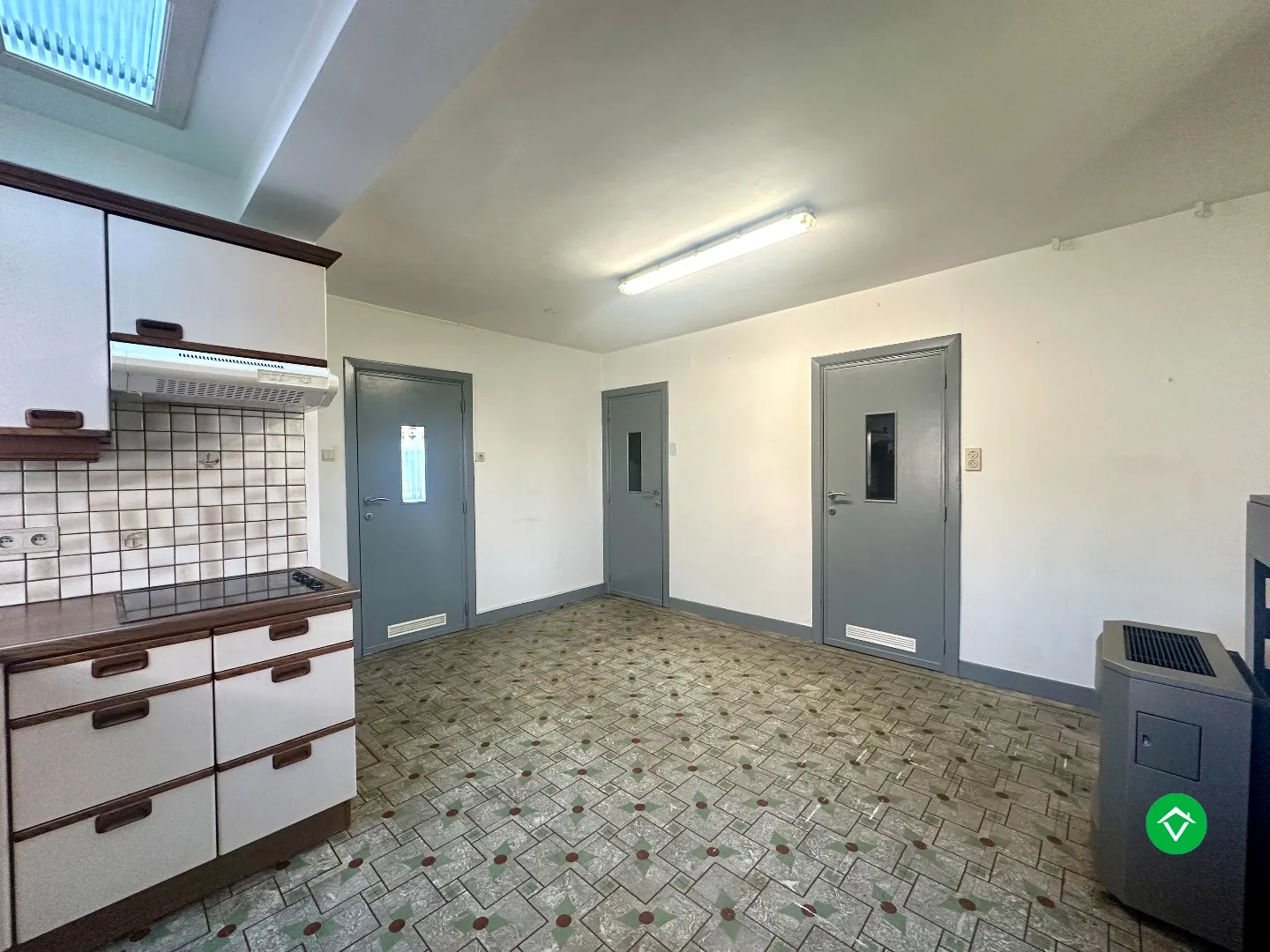 U komt binnen in een gezellige voorplaats die dienst kan doen als woon- of eetkamer. Aansluitend bevindt zich een tweede leefruimte met toegang tot de badkamer, uitgerust met een douchecabine, lavabomeubel en toilet. Achteraan ligt de keuken met zicht op de veranda en tuin, en ruimte voor een eettafel.