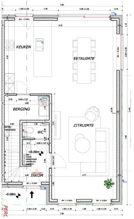 Gelijkvloers: inkomhal - gastentoilet - lichtrijke living met open ingerichte keuken - berging/wasplaats - carport.