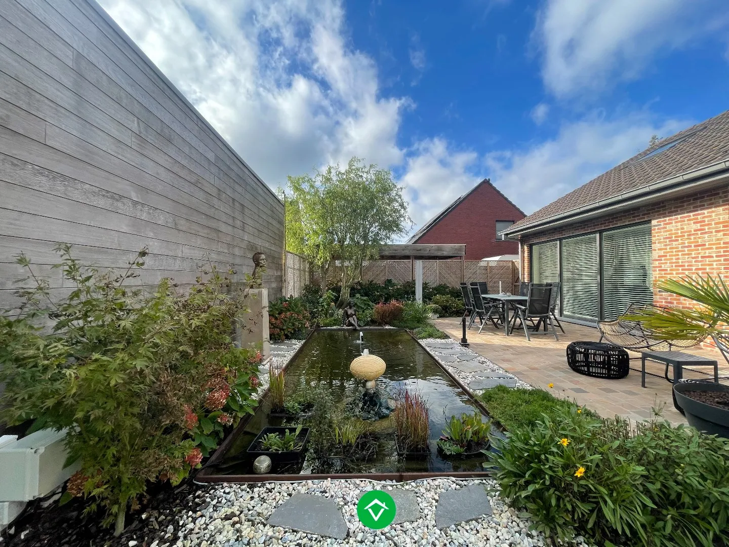 - De tuin is zonrijk en zuidgericht aangelegd met een vijver.