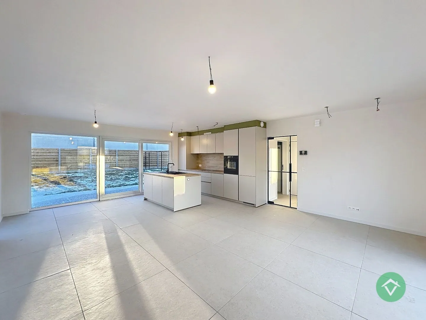 De woning betreedt u via de inkomhal, die aansluit op een ruime en lichtrijke leefruimte. Dankzij de open indeling vloeien de woonkamer, eetplaats en volledig uitgeruste keuken naadloos in elkaar over – ideaal voor gezellige momenten met familie of vrienden. Aansluitend aan de keuken bevindt zich een praktische berging met aansluiting voor wasmachine en extra opbergruimte.
