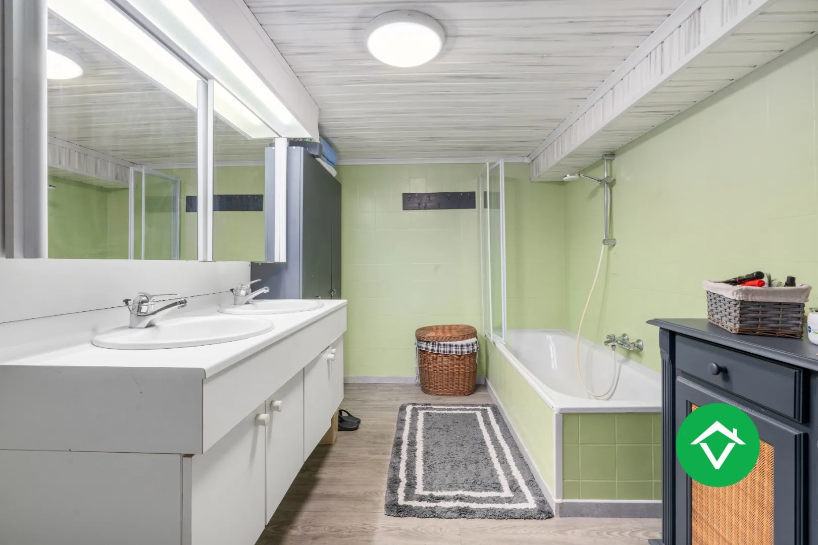 De inkomhal leidt rechtstreeks naar het terras, de garages en de ruime woonkamer. Aangrenzend vindt u een extra kamer op het gelijkvloers, ideaal als slaapkamer of bureau. Verder zijn er een kelder, berging, aparte keuken, wasruimte en gastentoilet. Op de eerste verdieping bevinden zich drie ruime slaapkamers en een badkamer met ligbad, douchescherm en dubbele wastafel.