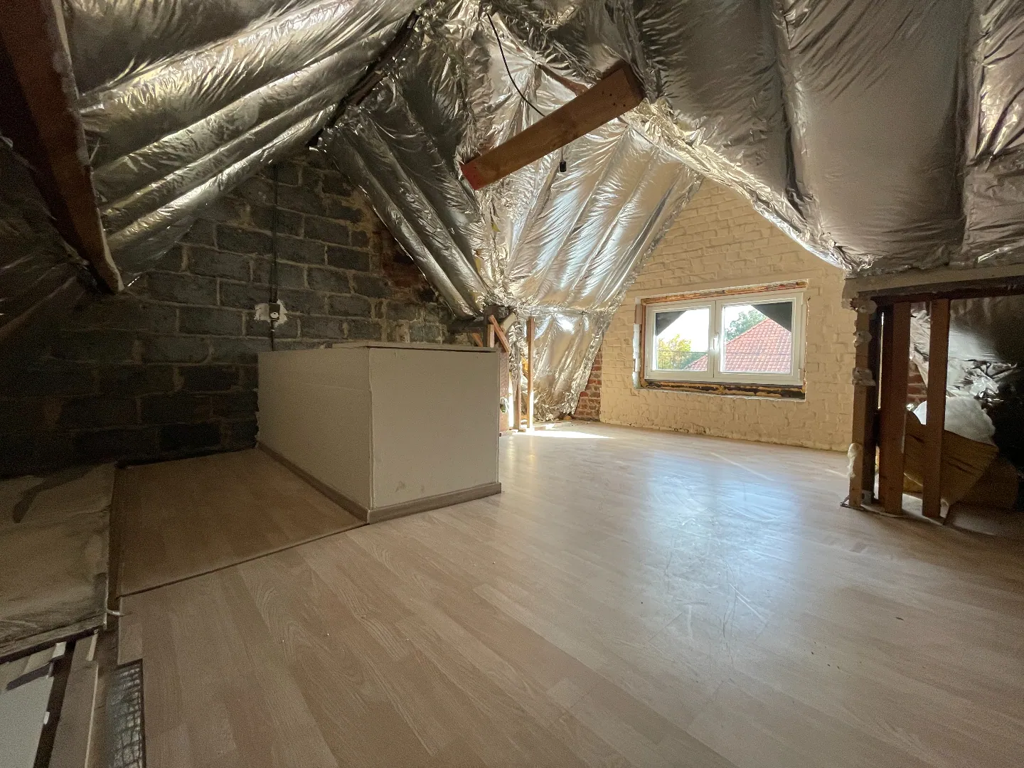 Op de eerste verdieping: 2 slaapkamers - badkamer met toilet - doorgang naar de ruime, in te richten zolder. De eerste verdieping is nog deels af te werken.