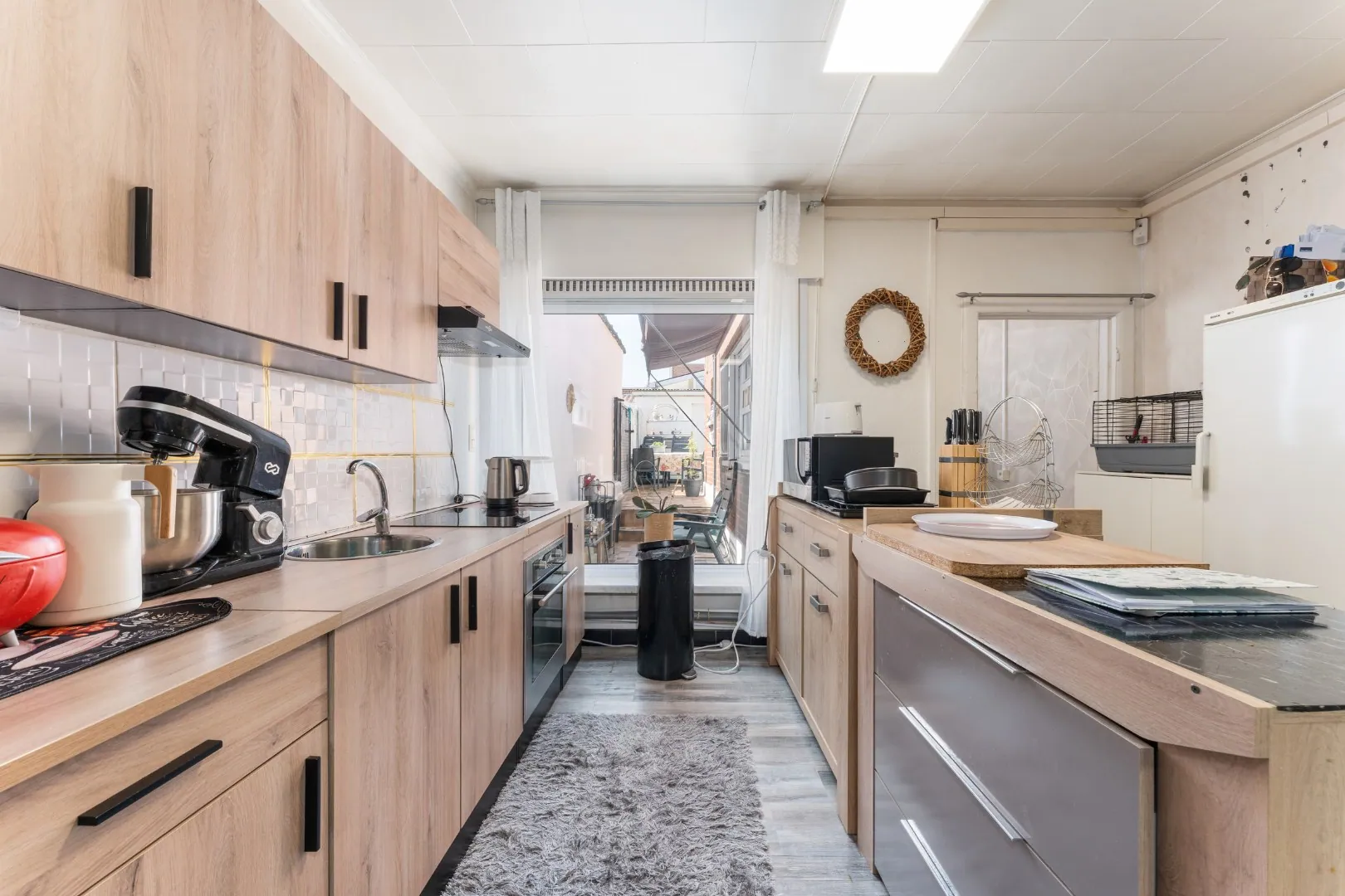 Binnenin geniet je van een ruime, lichtrijke leefruimte die overgaat in een gezellige eetplaats. De aansluitende keuken is volledig ingericht en biedt voldoende opbergmogelijkheden. Op het gelijkvloers bevinden zich ook een praktische wasplaats/berging en een badkamer.