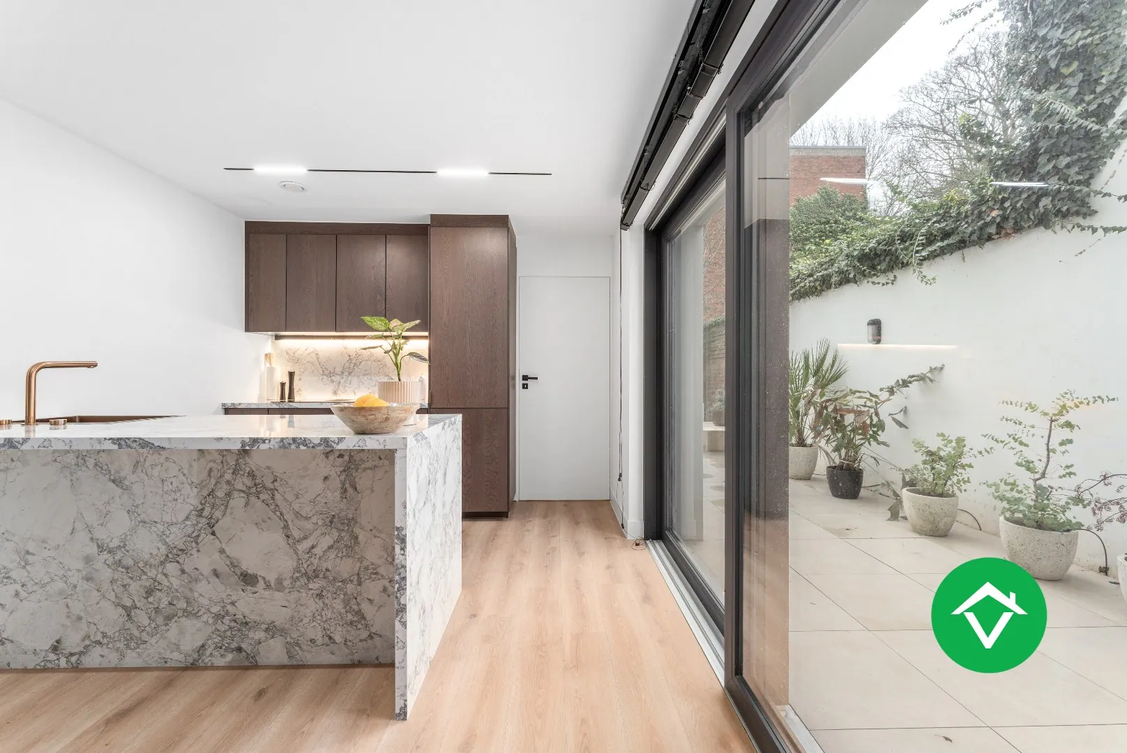 - Hoge afwerkingsgraad met oog voor detail: ingemaakte binnendeuren, ingebouwde armaturen, domotica