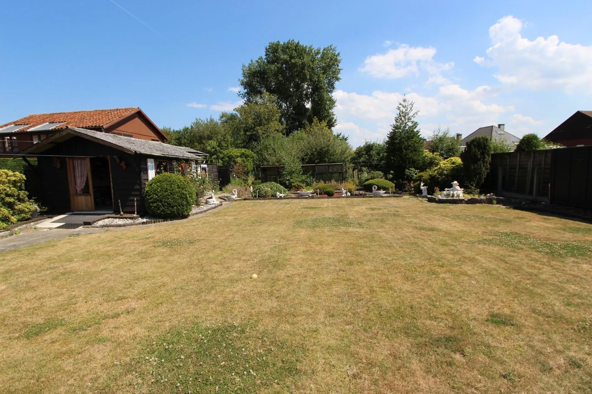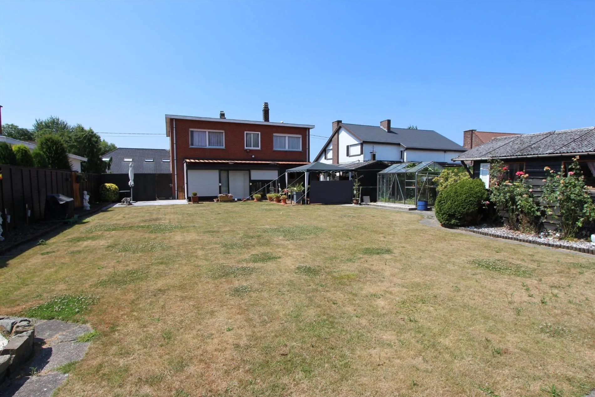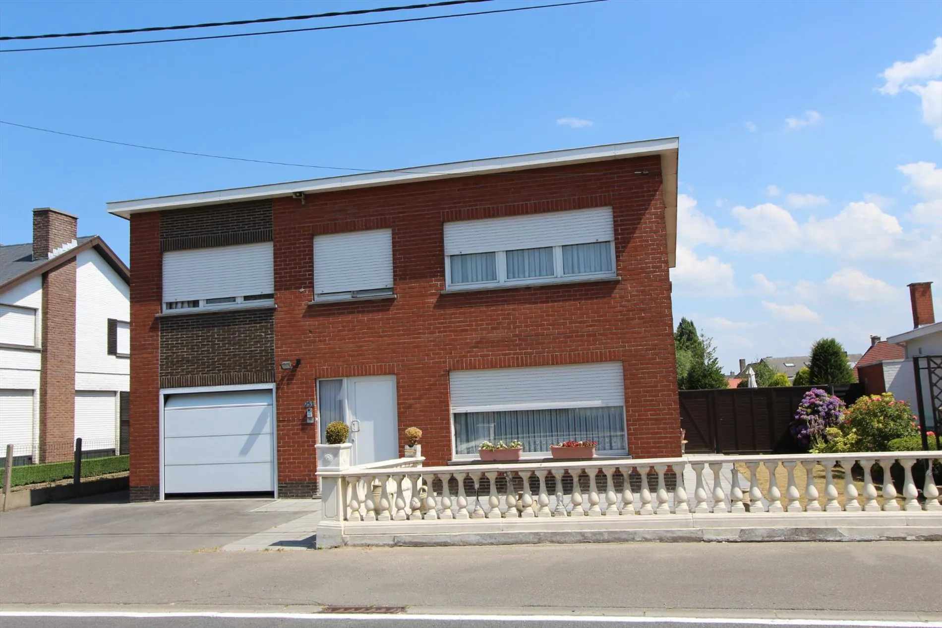 Deze alleenstaande woning is gelegen op een grondoppervlakte van 1157 m² en bestaat uit: oprit - voortuin - inkomhal - toilet - ruime living met ingebouwde haard - keuken - veranda - overdekt terras - wasplaats met doucheruimte - berging - kelder - 2 garages - zonneterras - zuidgerichte tuin - groot tuinhuis - houten bergplaats - nachthall - 4 slaapkamers - 1 bureau - badkamer. Overal rolluiken voorzien, centrale verwarming.