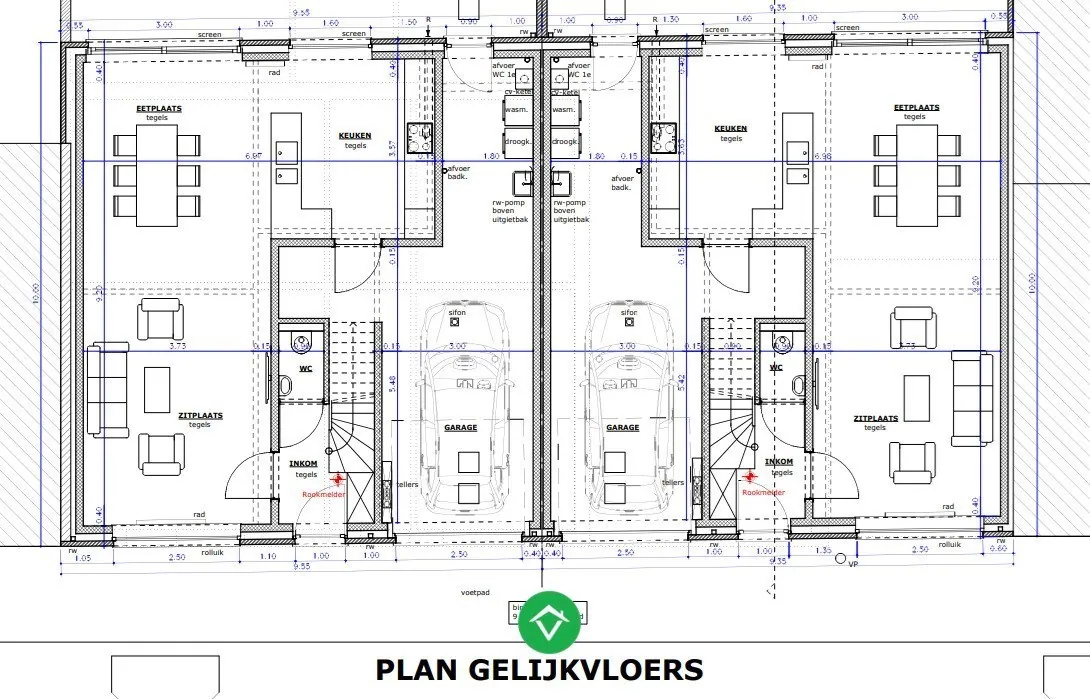 Gelijkvloers: inkomhal - gastentoilet - lichtrijke living - keuken - berging/wasplaats - garage - tuin - gemetste berging.